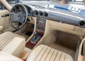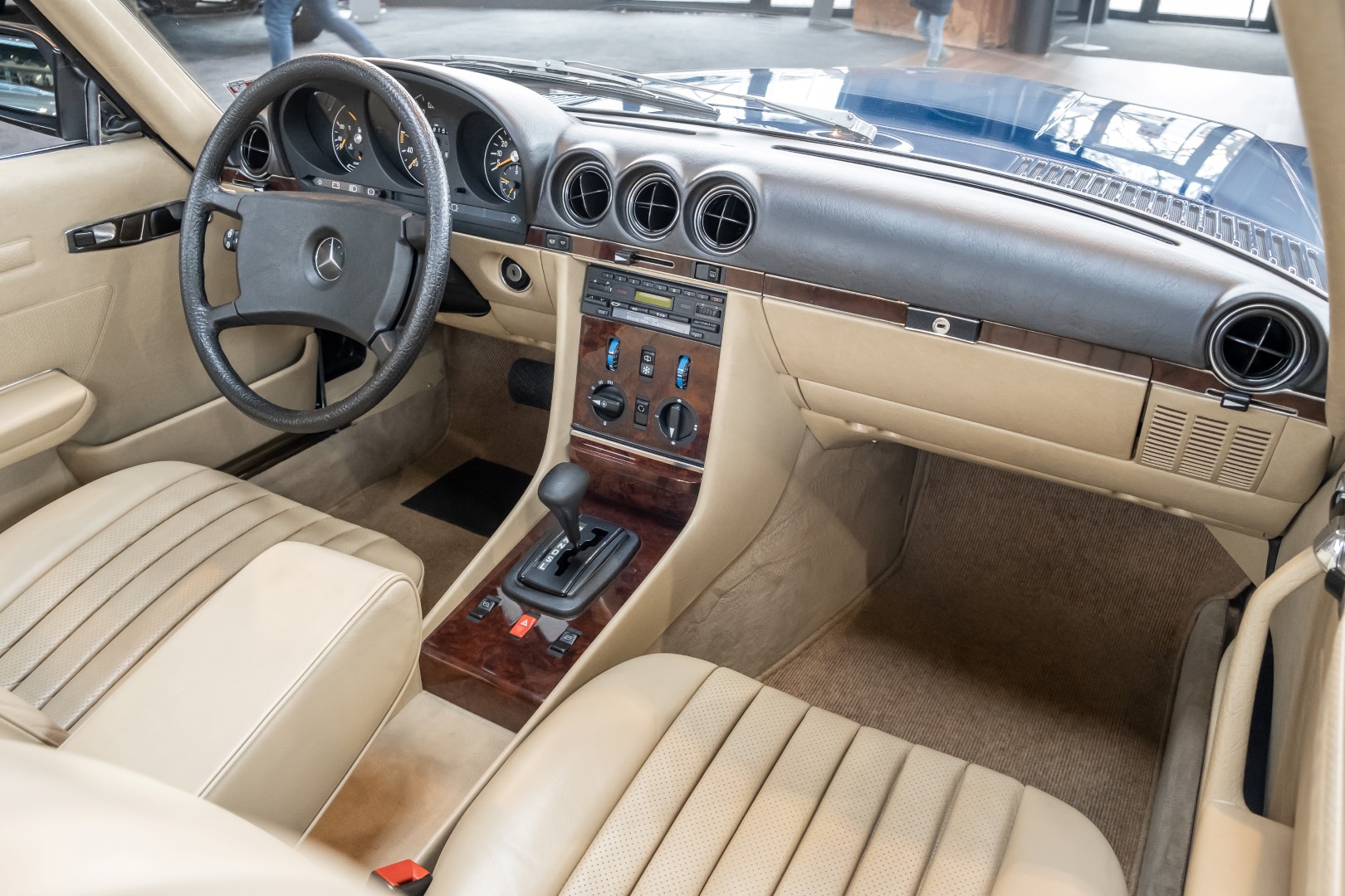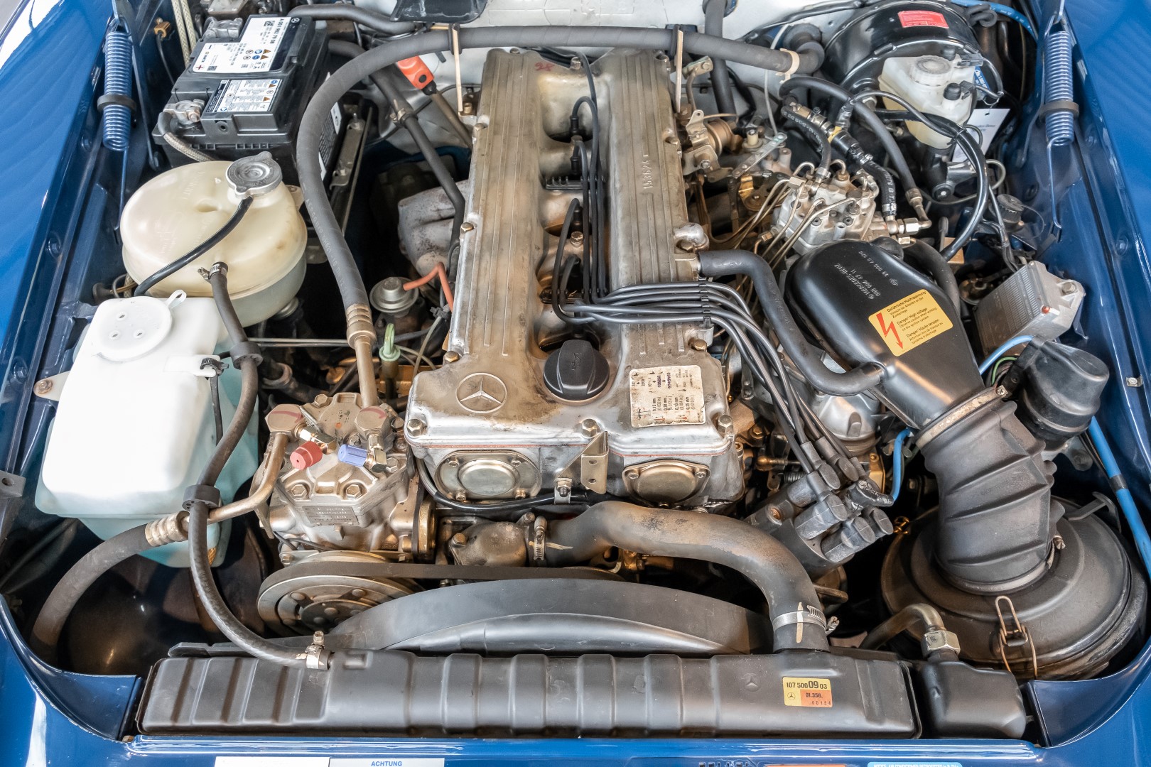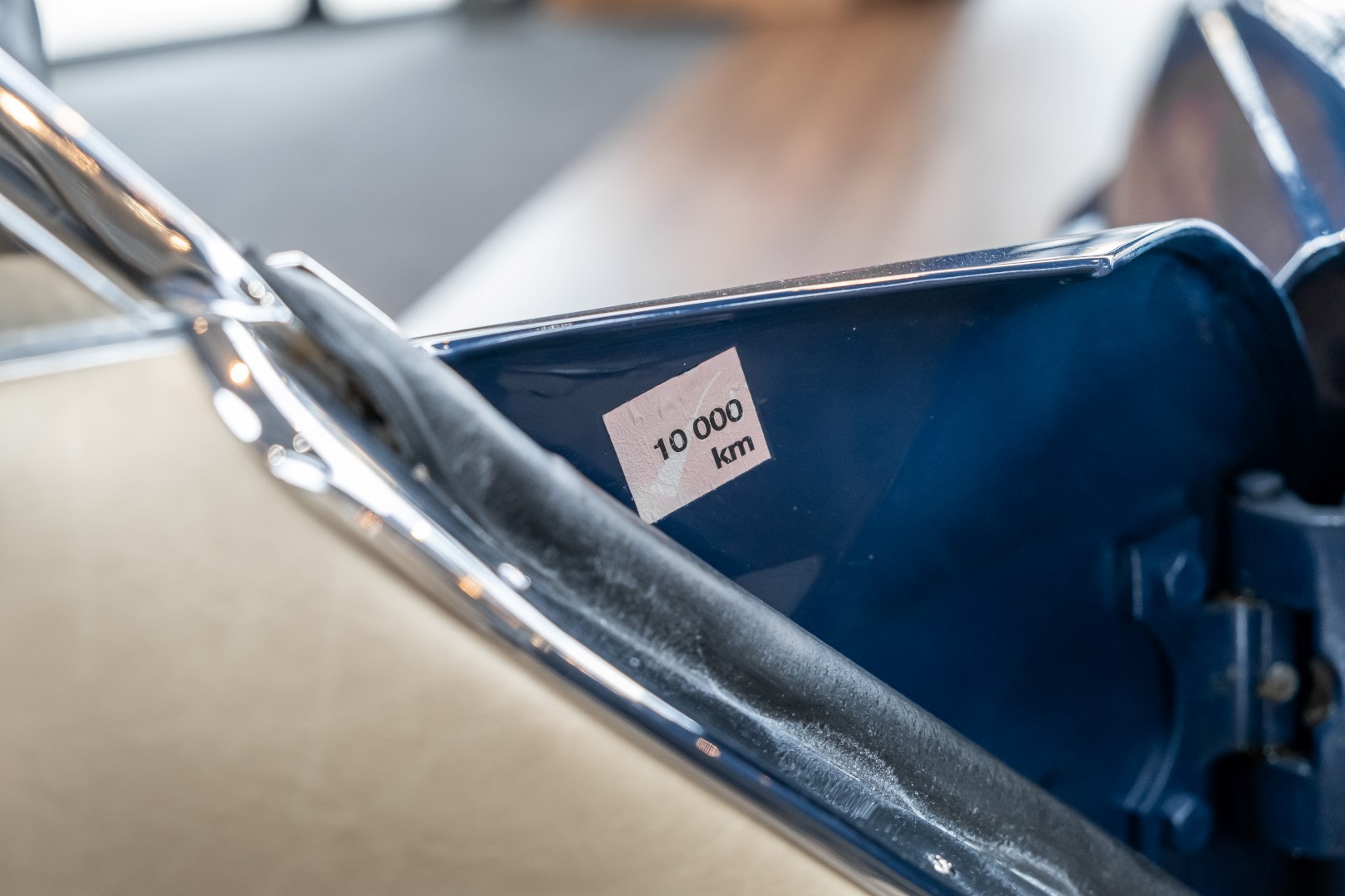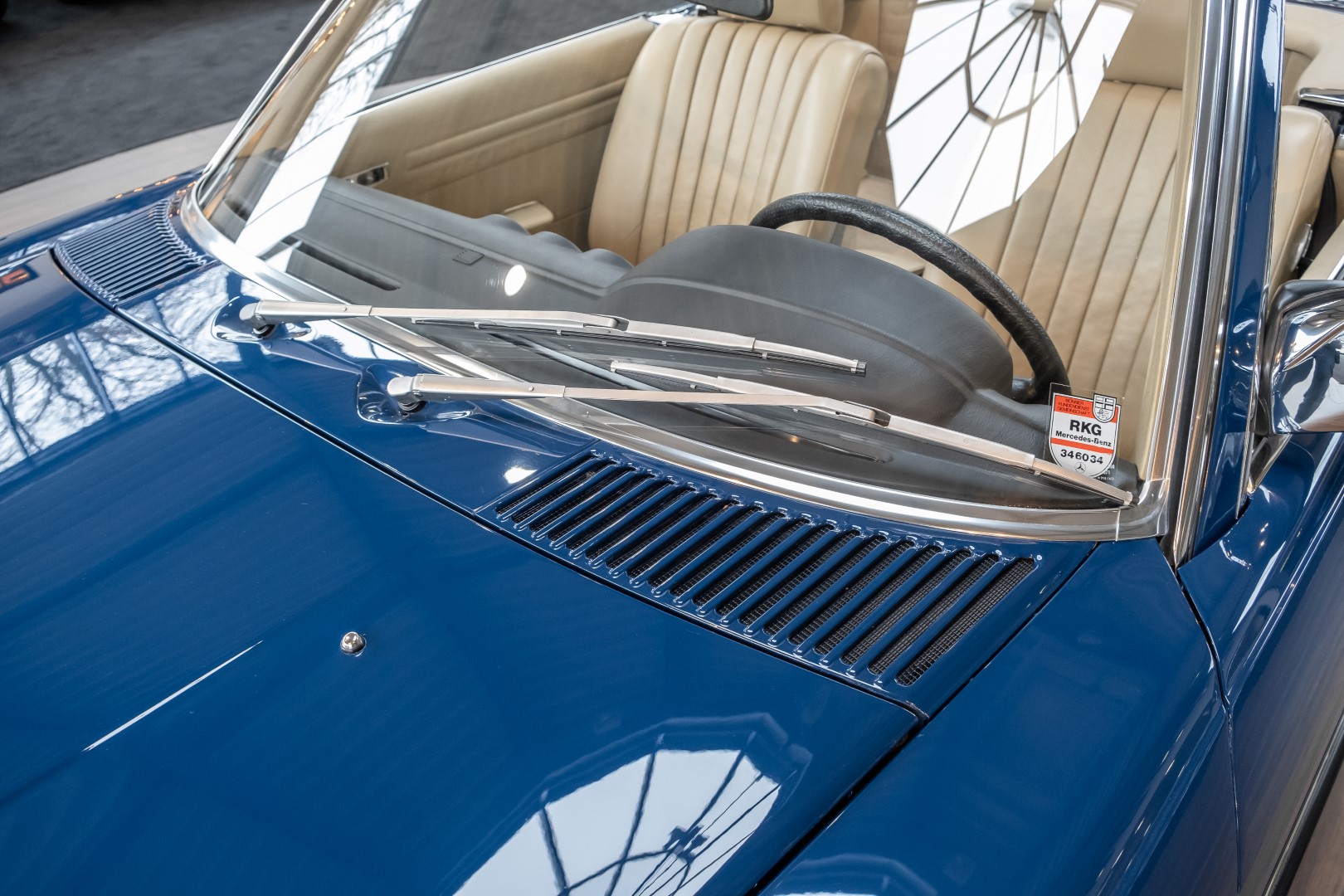 Stolze 62.708,21 DM bezahlte der damalige Besteller – ein erfolgreicher Händler für Landmaschinen und -teile aus Bonn – für den Roadster-Traum in Surfblau (900. Die Liste der Zusatzausstattungen war vergleichsweise lang: Lederausstattung in Creme (255), Automatikgetriebe, Mittelarmlehne, Klimaanlage, elektrische Fensterheber und Leichtmetallräder verliehen dem Roadster das gewisse Etwas und die ganz eigene Note des Besitzers. Das Kassettenradio Becker Grand Prix war ebenfalls mit an Bord. Natürlich sind auch hier alle Unterlagen vorhanden: von der Bedienungsanleitung über die Demonstrations-Kassette bis hin zum Garantie-Scheckheft und den original Tonkopf-Reinigungsstäbchen!