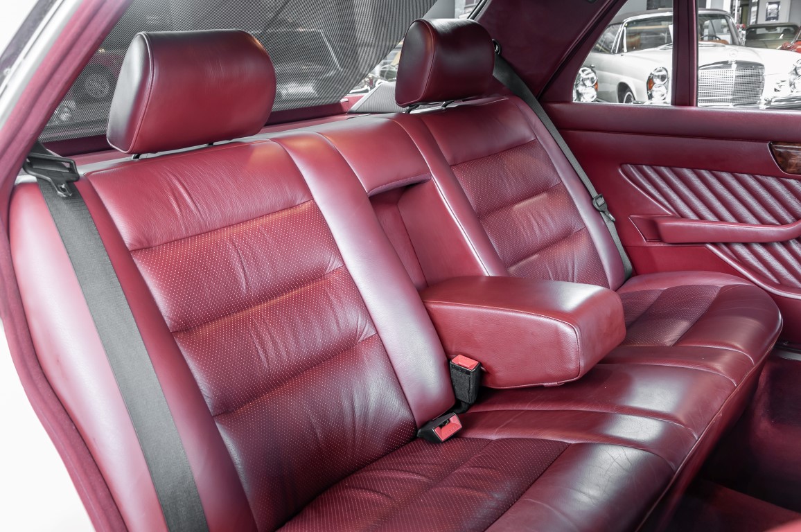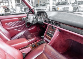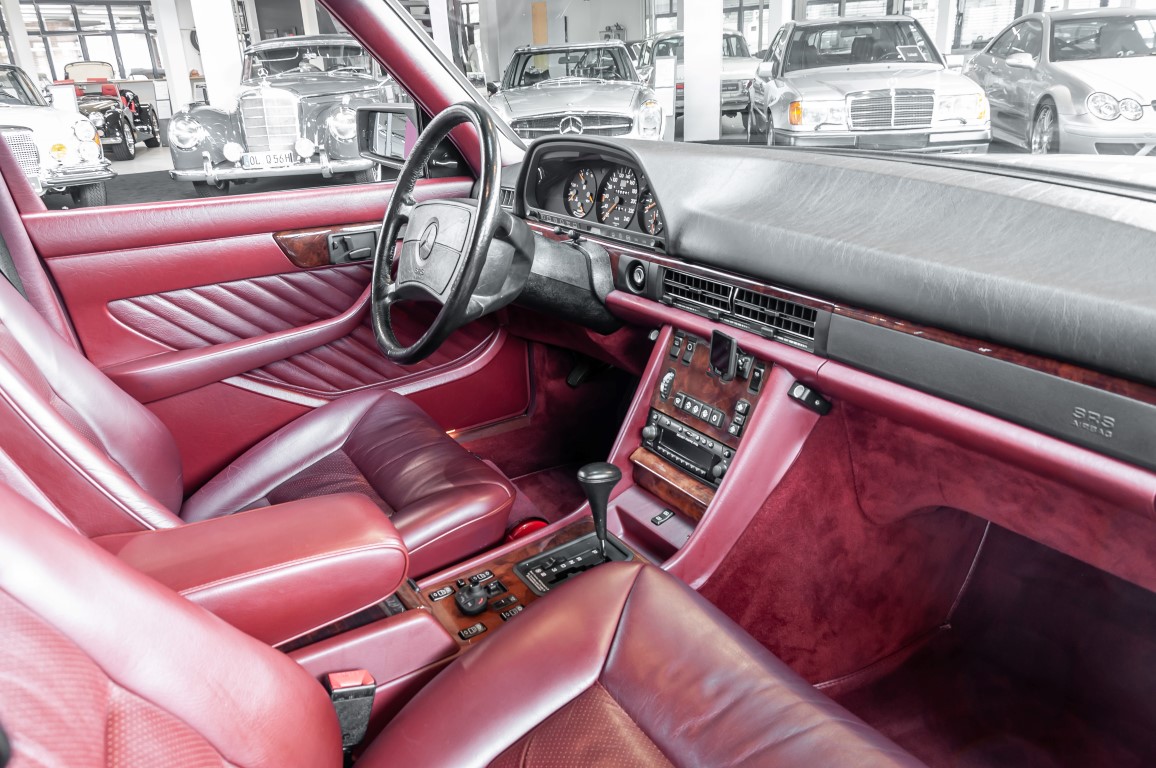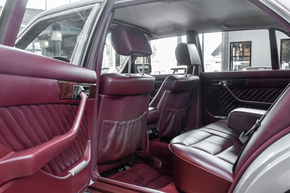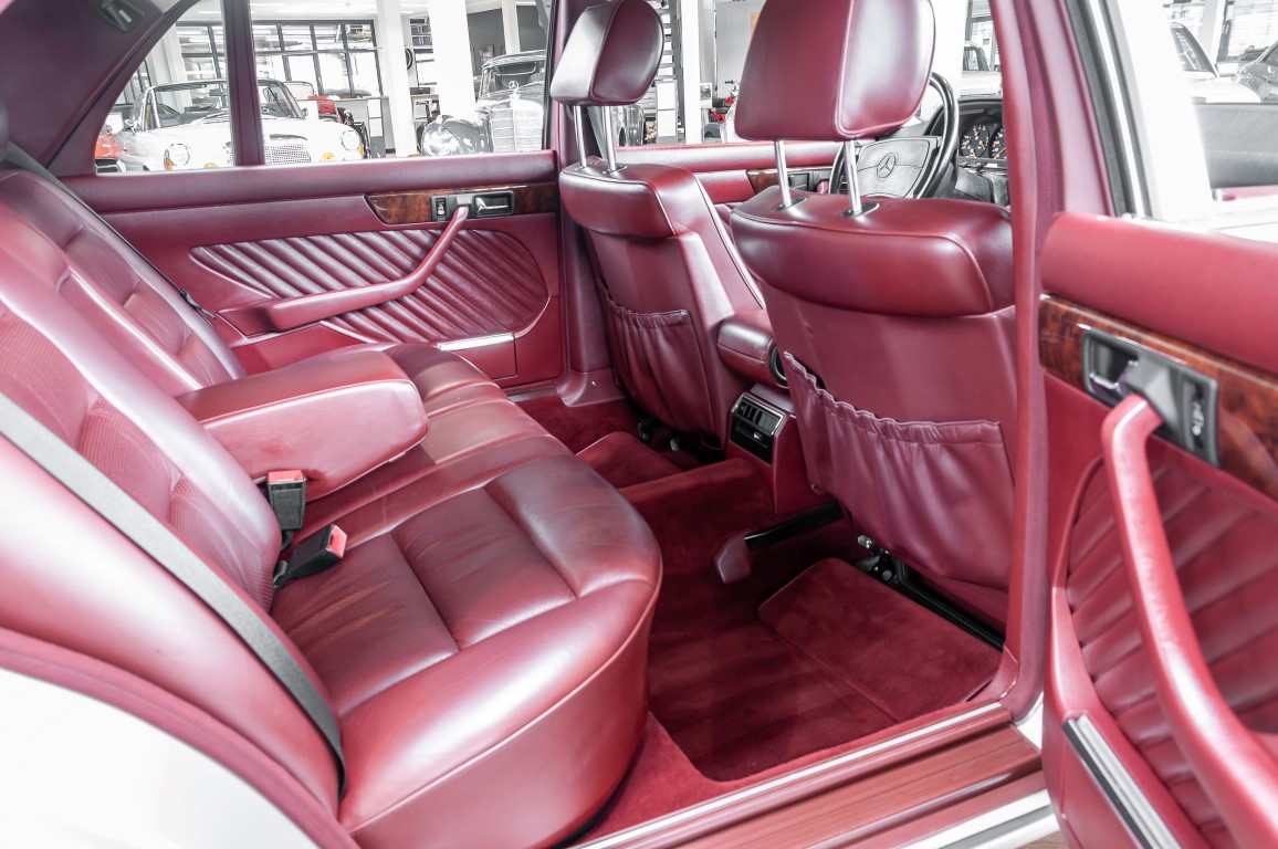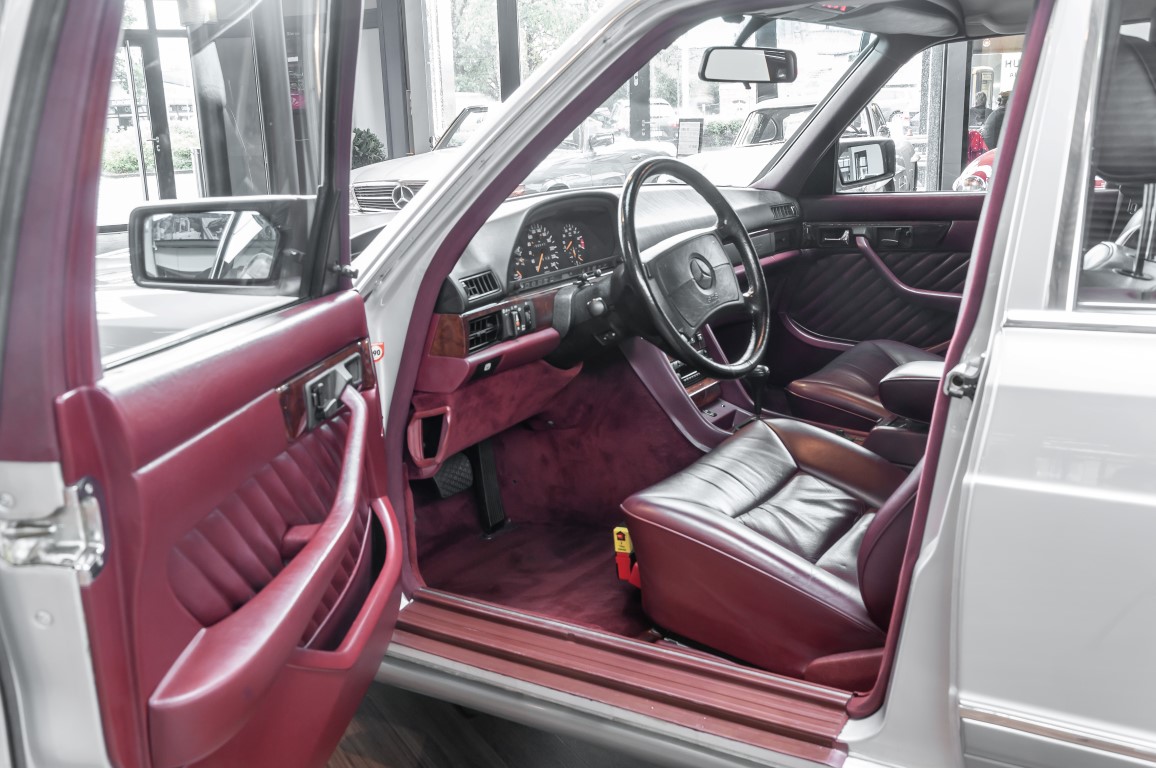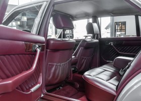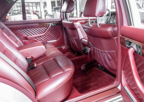 Die Ausstattung des als Langversion gebauten Fahrzeugs war umfangreich. So gehörte z.B. eine Antischlupfregelung (ASR) ebenso zum Lieferumfang wie eine Klimatisierungsautomatik, Holzausführung in edlem Wurzelnuss, elektrisch verstellbare Vordersitze, ein hochwertiges Becker Radio und Fußstützen im Fond. Die Farbgebung (735) astralsilber-metallic in Verbindung mit Lederausstattung in (267) Mittelrot wirkt edel und freundlich zugleich. Der Wagen blieb all die Jahre im hohen Norden Deutschlands und gehörte nach seinem Erstbesitzer einem in der gleichen Gegend wohnenden Apotheker Ehepaar und wurde in 2012 Bestandteil einer Sammlung edler Fahrzeuge am gleichen Ort. Aufgrund einer Verkleinerung der Sammlung kam nun der Wagen in unseren Besitz.