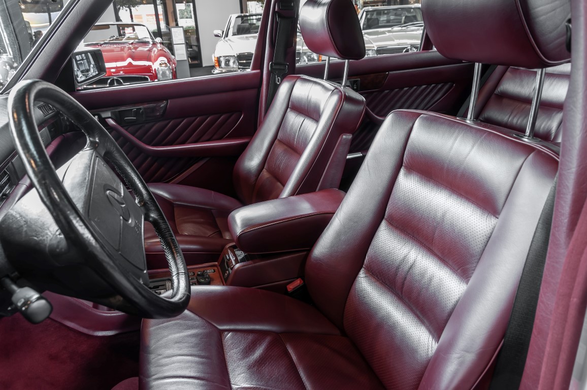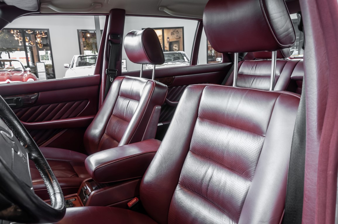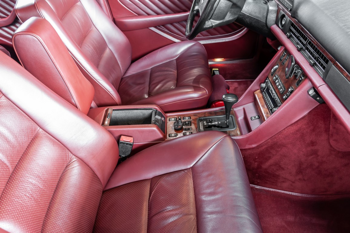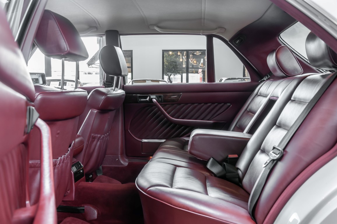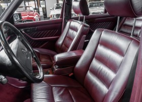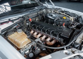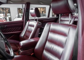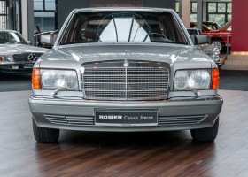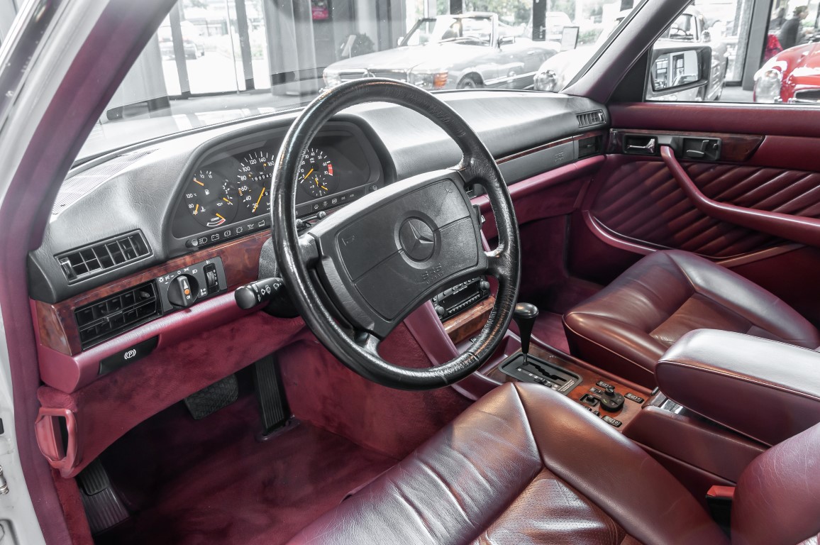 Die Ausstattung des als Langversion gebauten Fahrzeugs war umfangreich. So gehörte z.B. eine Antischlupfregelung (ASR) ebenso zum Lieferumfang wie eine Klimatisierungsautomatik, Holzausführung in edlem Wurzelnuss, elektrisch verstellbare Vordersitze, ein hochwertiges Becker Radio und Fußstützen im Fond. Die Farbgebung (735) astralsilber-metallic in Verbindung mit Lederausstattung in (267) Mittelrot wirkt edel und freundlich zugleich. Der Wagen blieb all die Jahre im hohen Norden Deutschlands und gehörte nach seinem Erstbesitzer einem in der gleichen Gegend wohnenden Apotheker Ehepaar und wurde in 2012 Bestandteil einer Sammlung edler Fahrzeuge am gleichen Ort. Aufgrund einer Verkleinerung der Sammlung kam nun der Wagen in unseren Besitz.