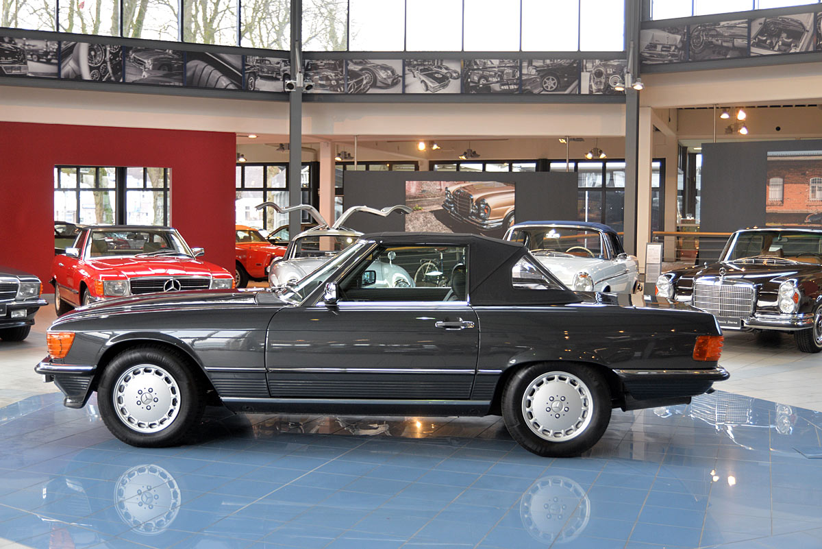 Ein solch modellgepflegtes und äußerst beliebtes Modell ist dieser Mercedes-Benz 500SL aus 1986, mit seinem kräftigen 8-Zylinder-Motor. Er wurde im Mai 1986 nach Bayern ausgeliefert und war im Besitz einer Dame im ländlichen Münchner Umkreis. Die Ausstattung war reichhaltig und beinhaltete unter anderem einen Fahrer-Airbag, wärmedämmende Rundumverglasung, beheizte Spiegel, Mittelarmlehne vorn und Fondsitzbank. Am 22. November 2013 ließ Sie den Wagen beim Landratsamt Bad Tölz-Wolfratshausen abmelden. Zum Jahreswechsel 2017/2018 übernahmen wir den Wagen in unseren Bestand und freuen uns, Ihnen diese echte Rarität anbieten zu können.