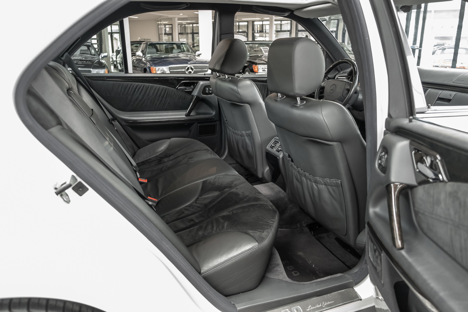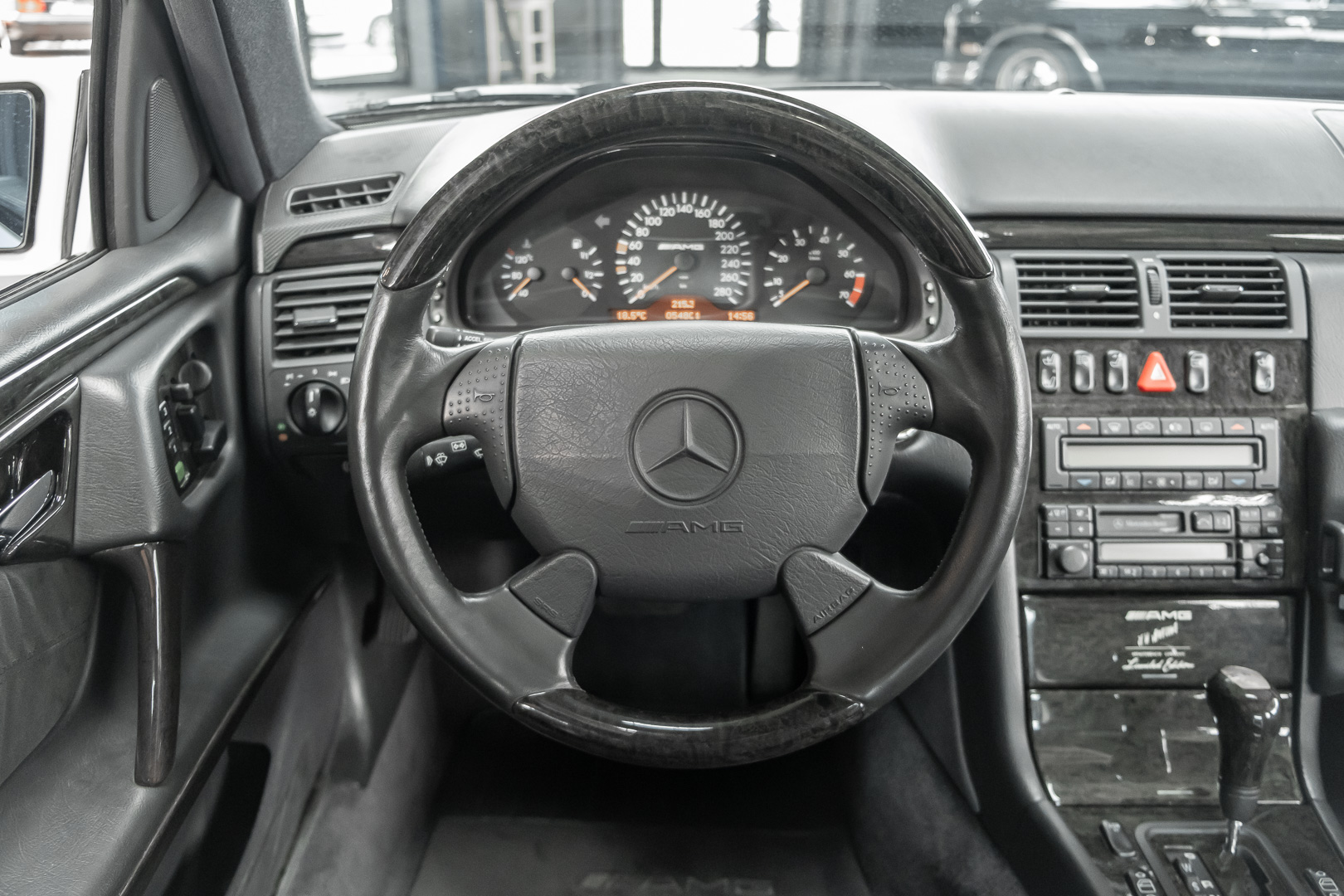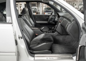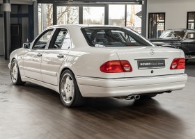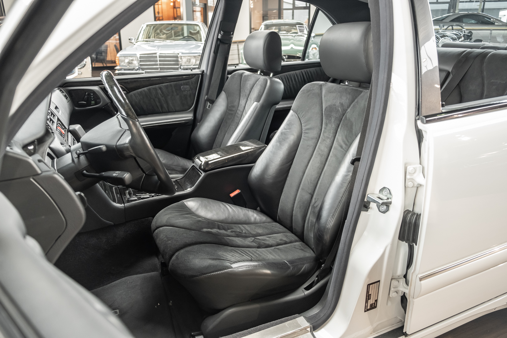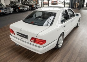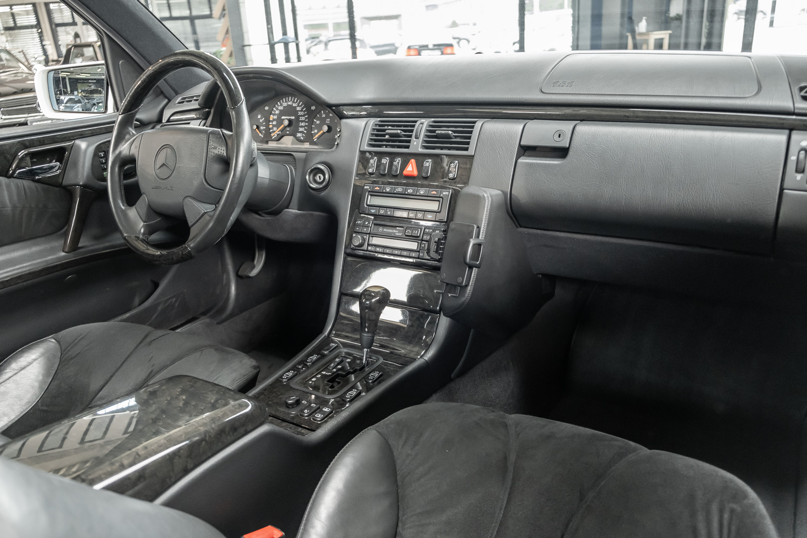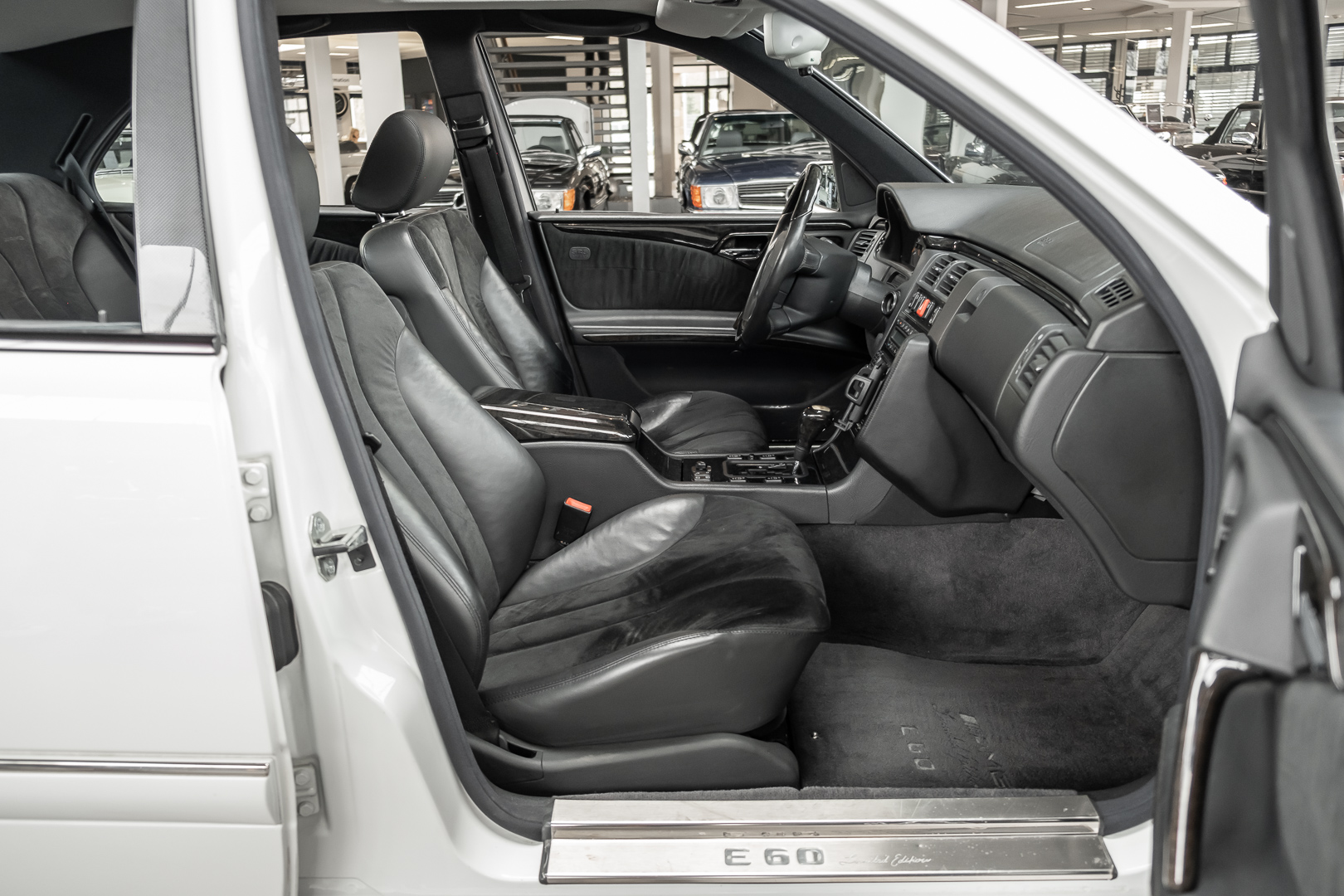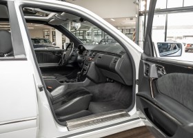 Wir freuen uns, Ihnen dieses 210er-Schmuckstück aus dem Hause AMG anbieten zu können. Zunächst verließ diese AMG-Rarität das Werk in Sindelfingen als E 50 AMG, der mit 347 PS bereits ausreichend Kraftreserven bereithielt. Bestimmt war die vollausgestattete Sport-Limousine in firnweiß für einen japanischen Kunden, der das Exklusive liebte. Genau das war der Grund, warum das Fahrzeug – vor der langen Reise nach Japan – erst noch nach Affalterbach gelang, wo die AMG-Experten auf die besondere Anfrage hin, den Umbau auf den leistungsgesteigerten E 60 AMG vornahmen. Der Umbau umfasste eine Leistungssteigerung durch AMG auf den hubraumvergrößerten Motor M 119-6.0 Kat, eine geänderte Achsübersetzung sowie angepasstes Getriebesteuergerät sowie ein AMG Holz-/Leder-Airbaglenkrad.
