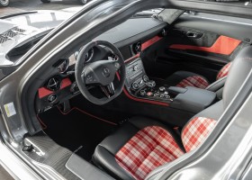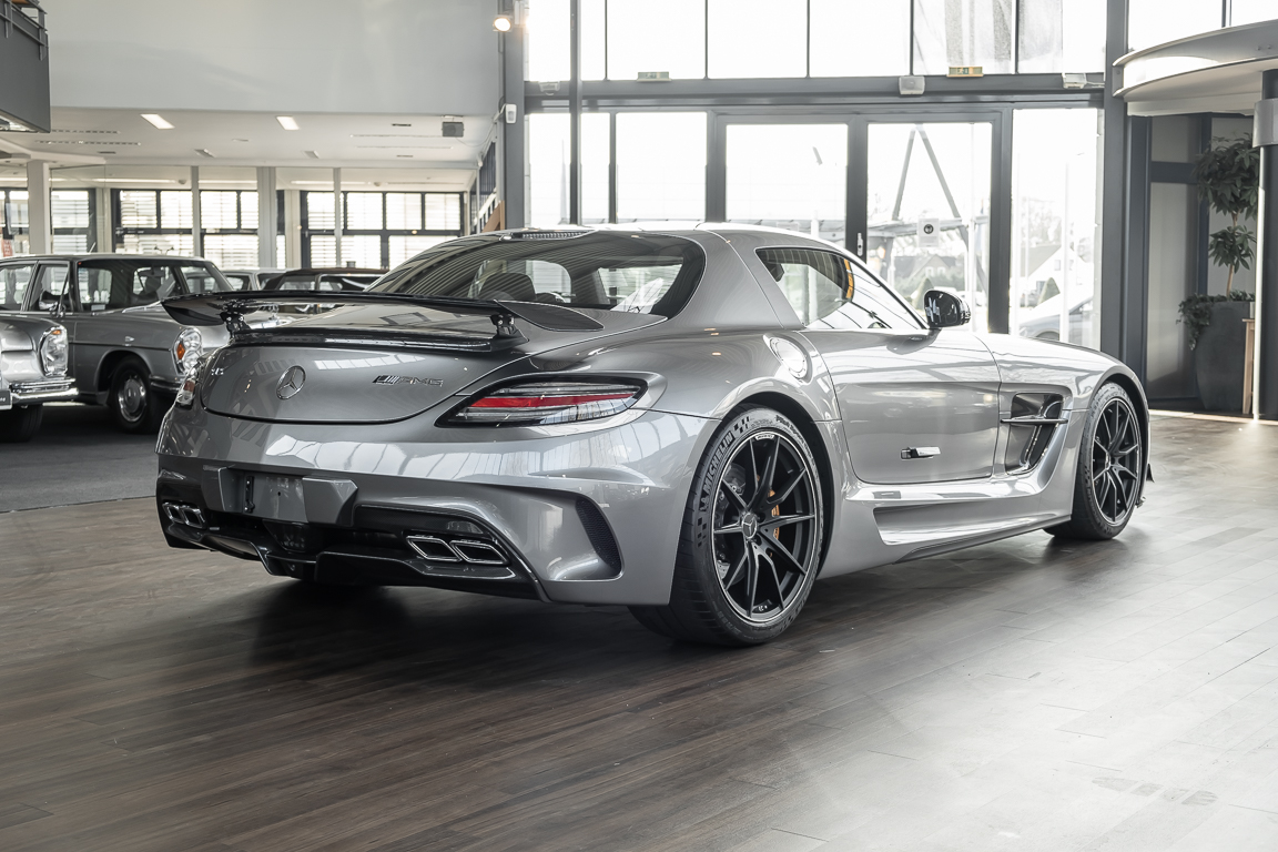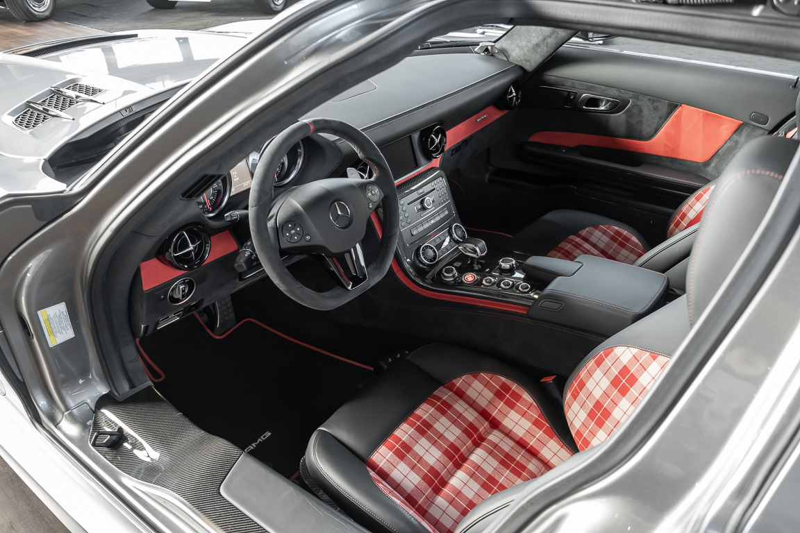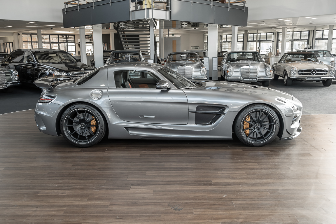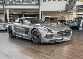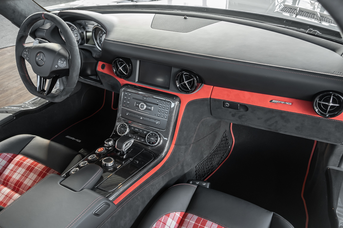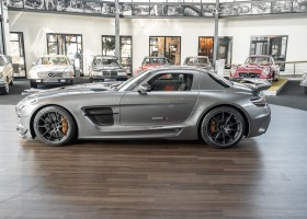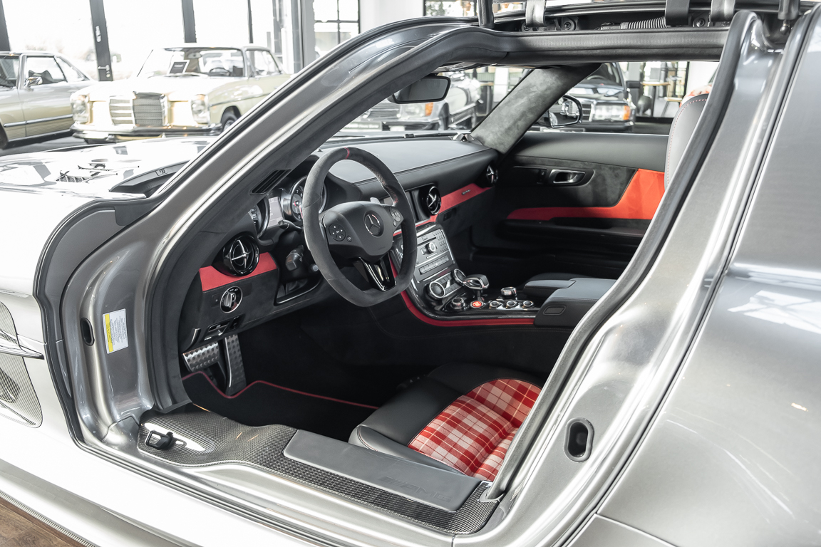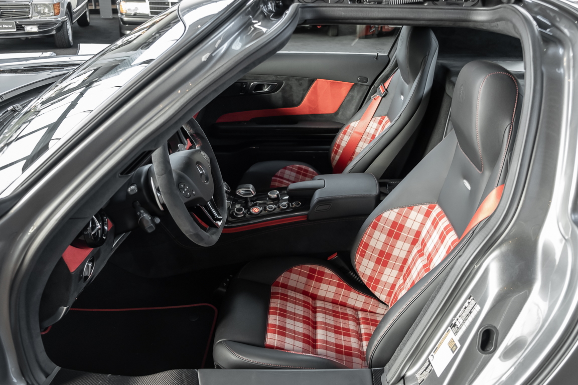 Wir freuen uns, Ihnen diese Sensation anbieten zu können: einen SLS AMG Black Series mit unglaublichen 850 Kilometern Laufleistung! Ein Black Series, dem man ganz ohne Zweifel den Neuwagenstatus attestieren kann – trotz seines Alters von mittlerweile 9 Jahren. Das Fahrzeug besitzt eine deutsche Zulassung wurde aber defakto nur zu Erhaltungsfahrten bewegt. In unserem Hause wurde der Innenraum dieses Flügeltür-Coupés einem sensationellen Finish unterzogen. Mit dem original Karostoff aus dem legendären 300 SL Flügeltürter wurden die Sitze durch unseren Polsterer aufgearbeitet und fügen sich nunmehr perfekt in die rot abgesetzten Details des Innenraums. Ein absoluter Überflieger, dessen Einmaligkeit außer Frage steht. Machen Sie sich ein eigenes Bild und verfallen Sie der Schönheit dieser Sensation!