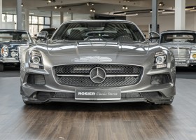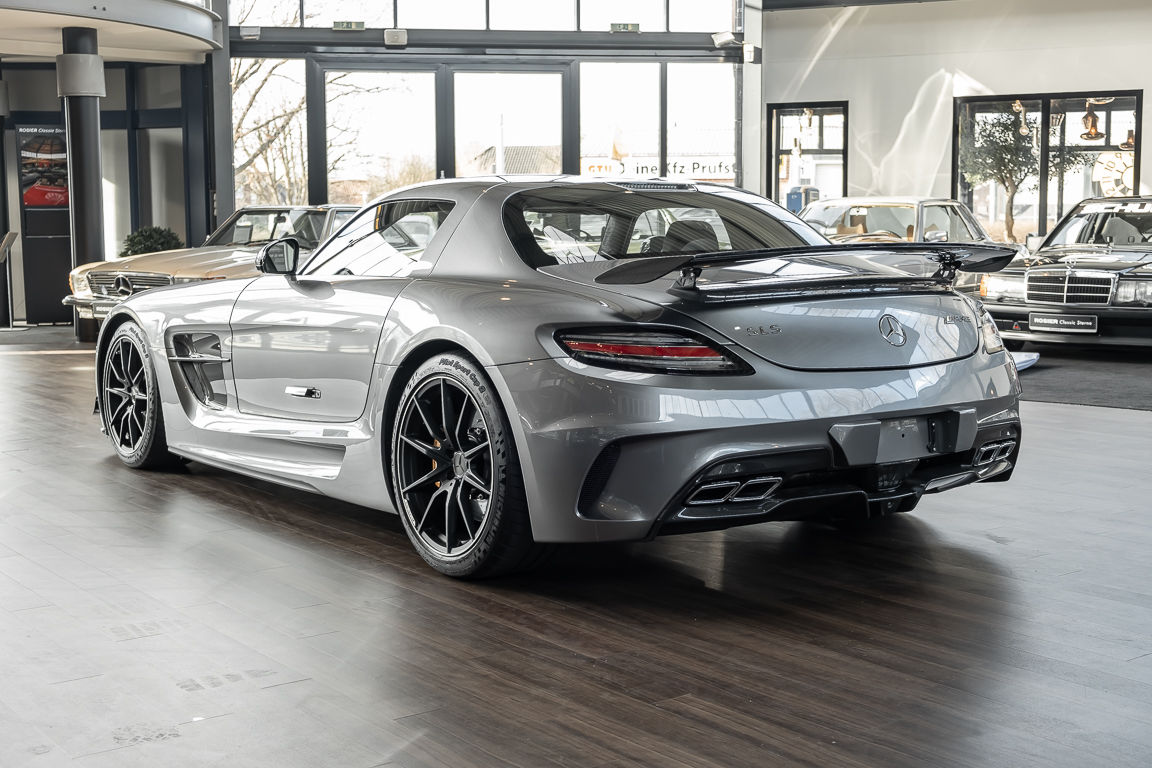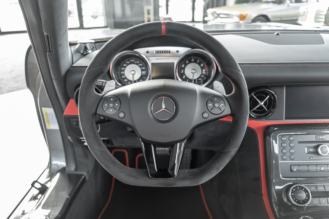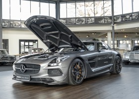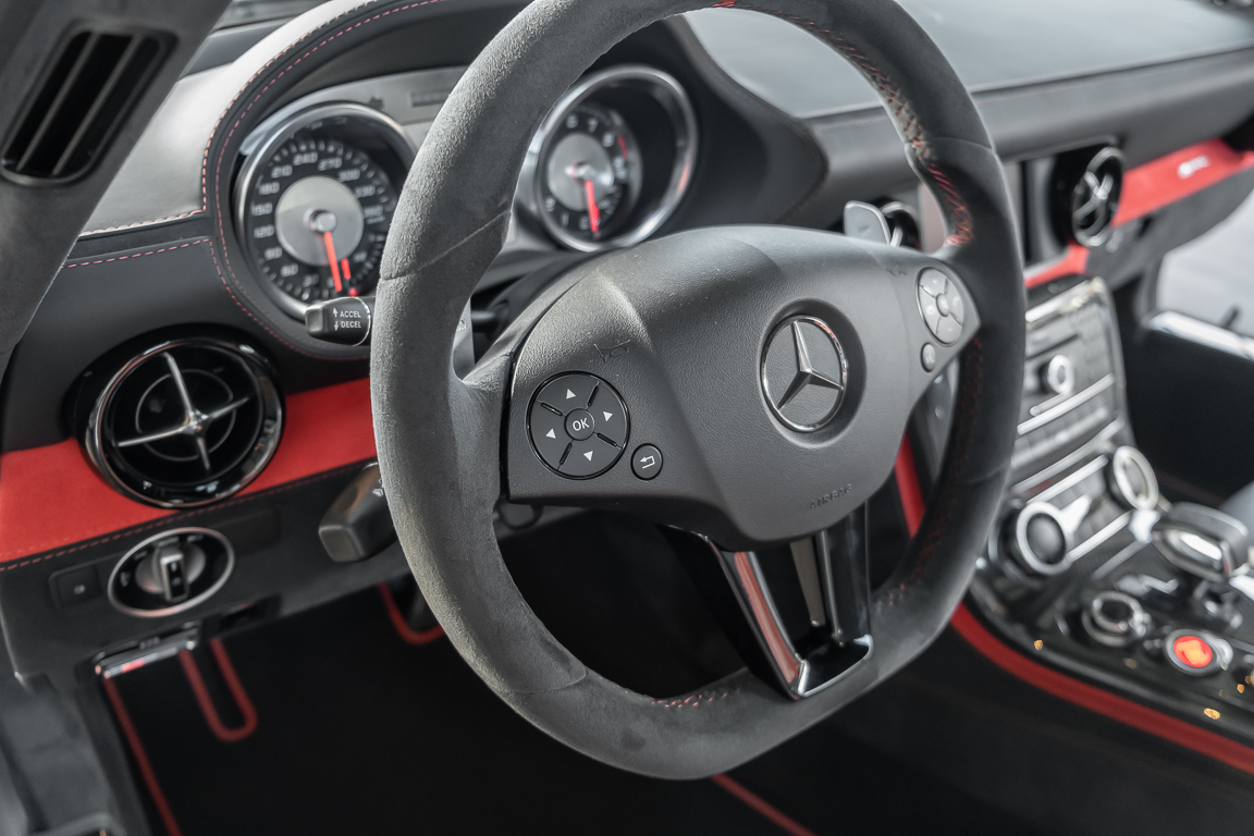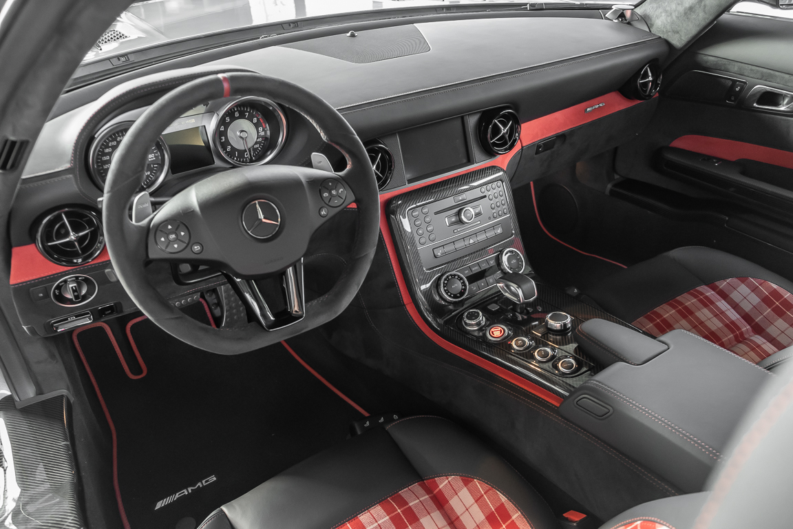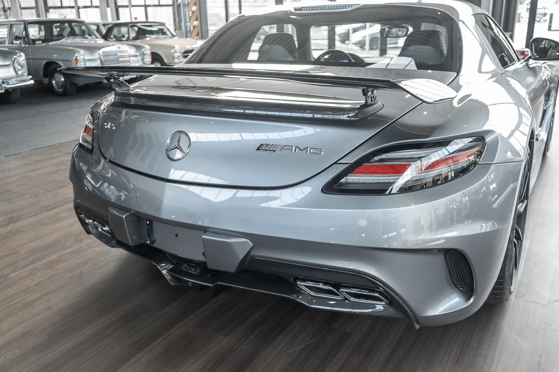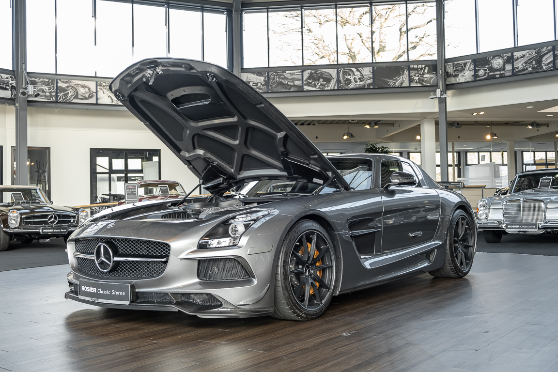 Wir freuen uns, Ihnen diese Sensation anbieten zu können: einen SLS AMG Black Series mit unglaublichen 850 Kilometern Laufleistung! Ein Black Series, dem man ganz ohne Zweifel den Neuwagenstatus attestieren kann – trotz seines Alters von mittlerweile 9 Jahren. Das Fahrzeug besitzt eine deutsche Zulassung wurde aber defakto nur zu Erhaltungsfahrten bewegt. In unserem Hause wurde der Innenraum dieses Flügeltür-Coupés einem sensationellen Finish unterzogen. Mit dem original Karostoff aus dem legendären 300 SL Flügeltürter wurden die Sitze durch unseren Polsterer aufgearbeitet und fügen sich nunmehr perfekt in die rot abgesetzten Details des Innenraums. Ein absoluter Überflieger, dessen Einmaligkeit außer Frage steht. Machen Sie sich ein eigenes Bild und verfallen Sie der Schönheit dieser Sensation!