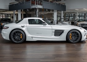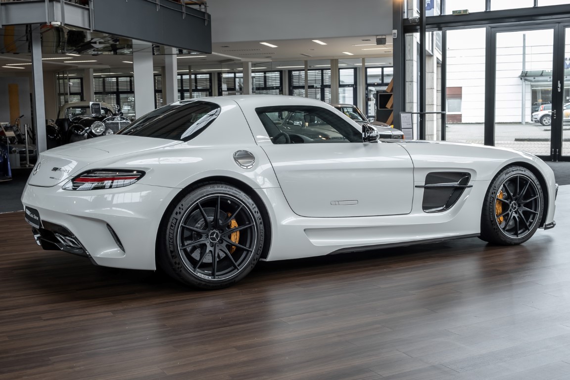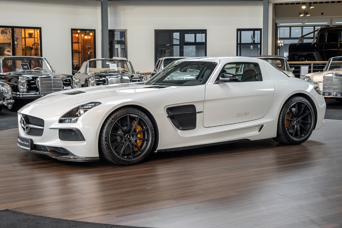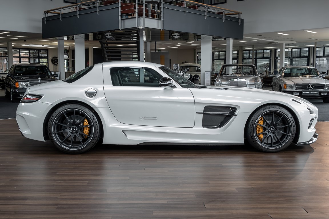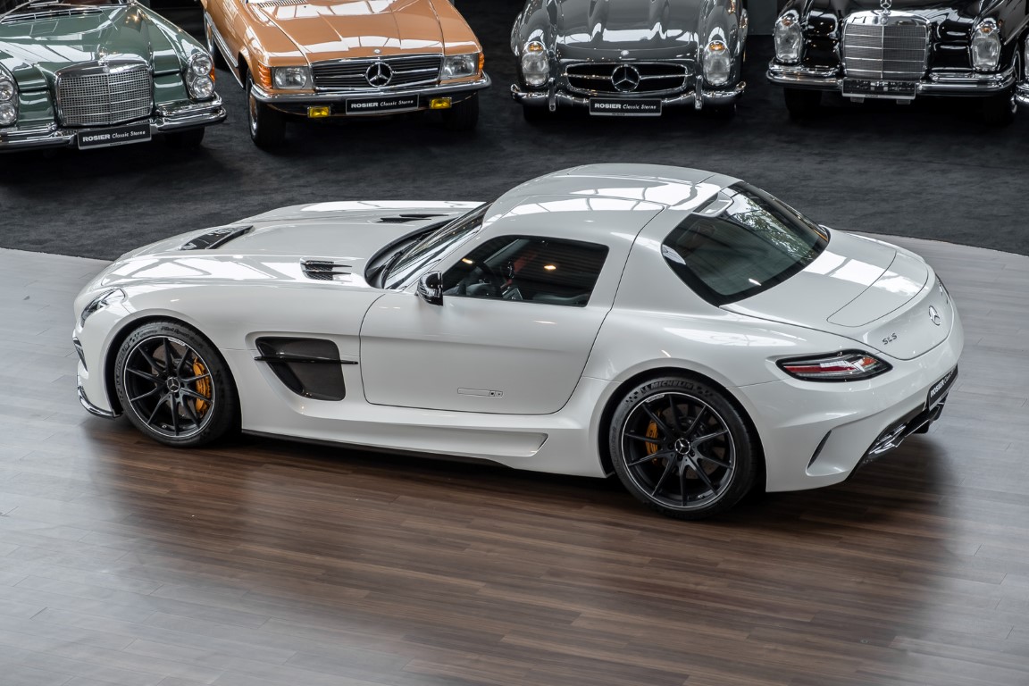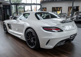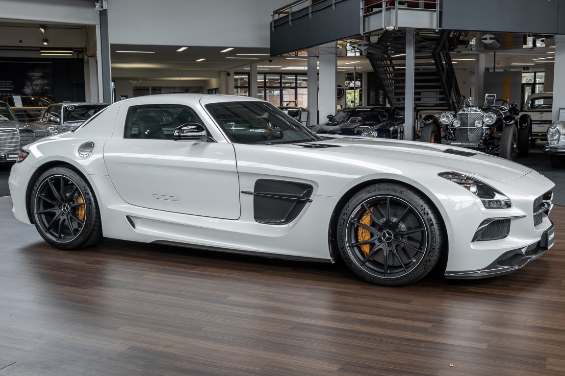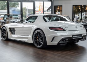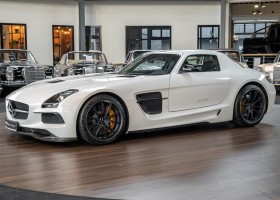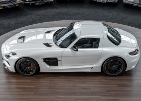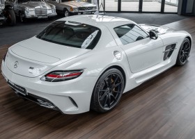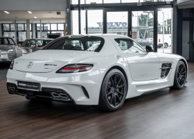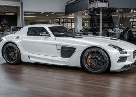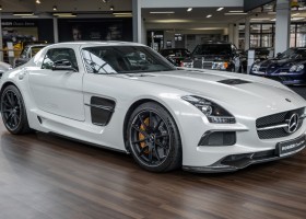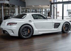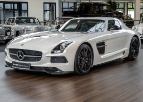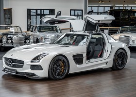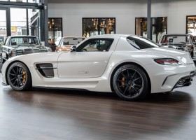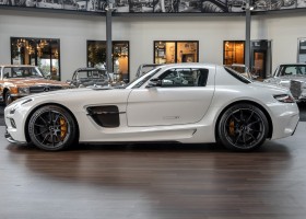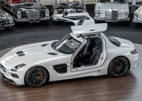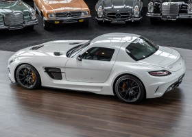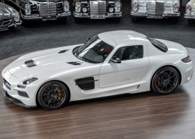June 2013 saw the official sales launch of the high-end version of the gullwing, the SLS AMG Coupé Black Series. Whoever wanted this super sports coupé inspired by the racing version SLS AMG GT3 had to be fast: Because the mere 408 units were eagerly awaited by collectors from all over the world and were sold out immediately. The fifth Black Series model from Mercedes-AMG fascinated its enthusiasts with its breathtaking design, outstanding driving dynamics and consistent lightweight construction. With an unladen weight of 1550 kilograms and an engine output of 631 hp at 7400 rpm, the SLS AMG Black Series achieves a power-to-weight ratio of 2.45 kg/hp. This catapults the most dynamic street-legal gullwing to 100 km/h in just 3.6 seconds.