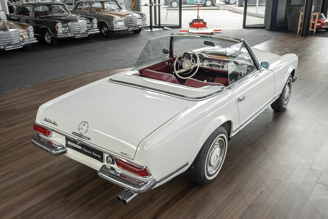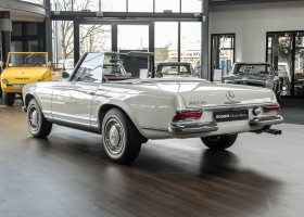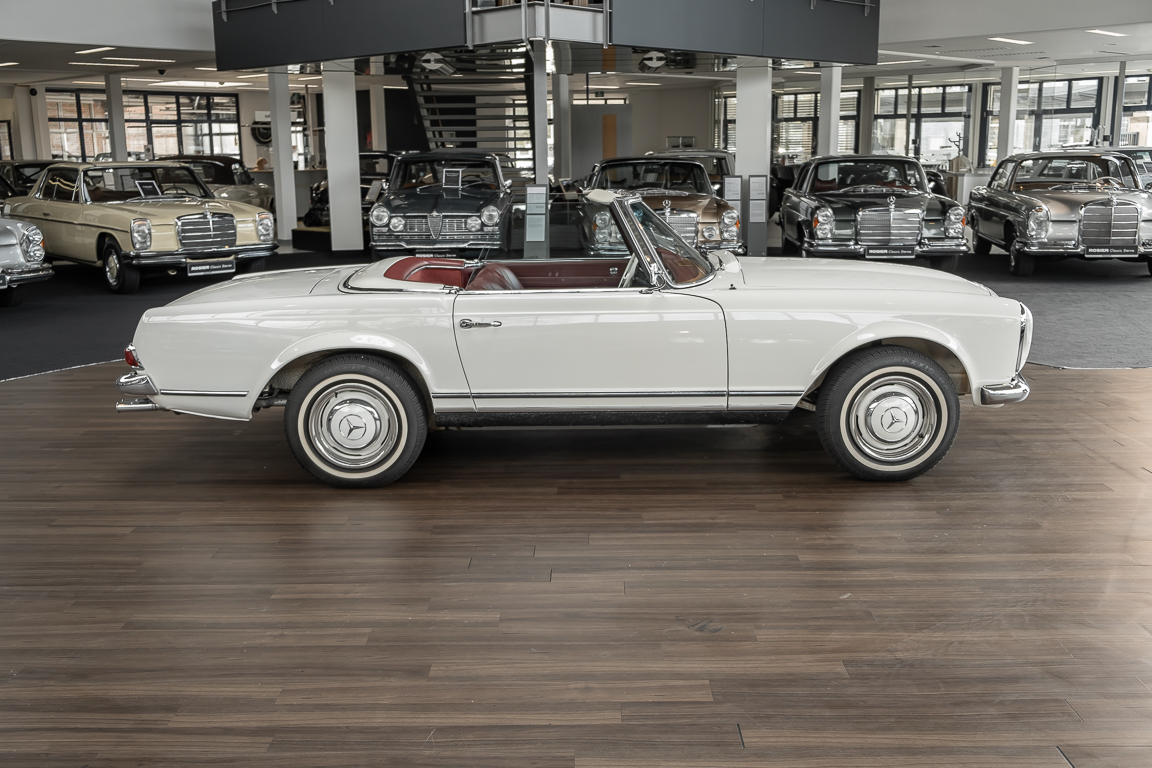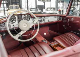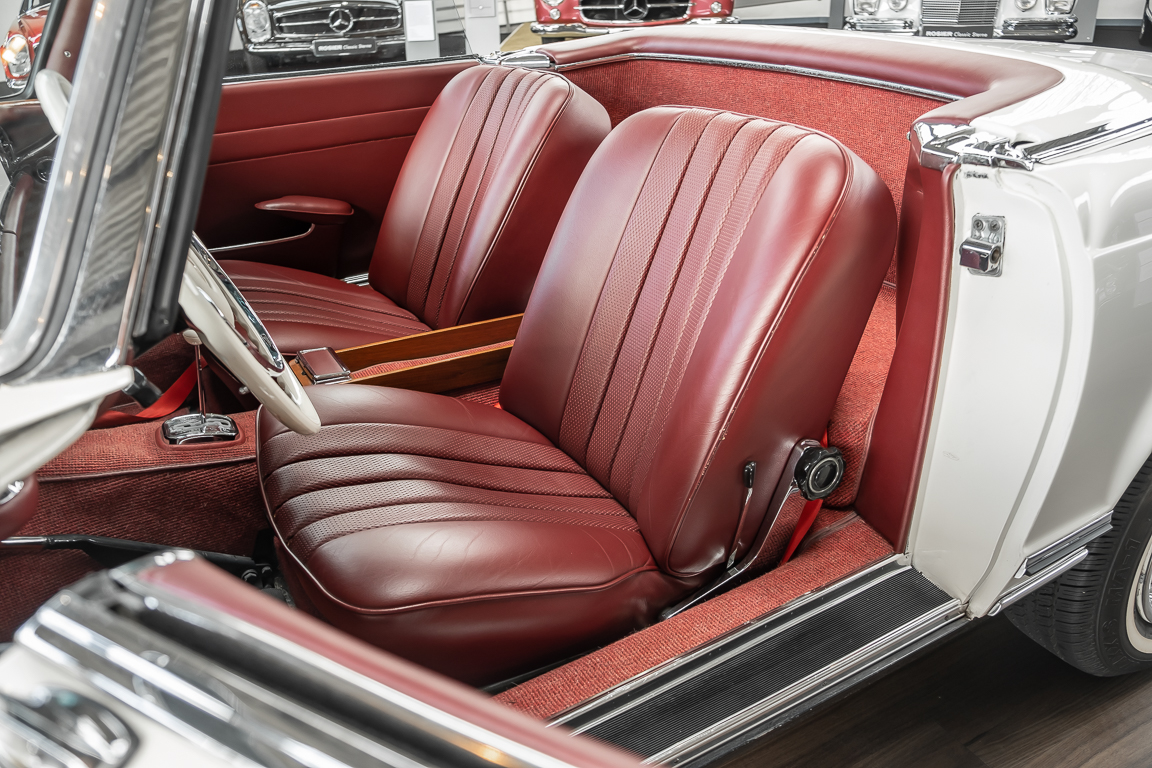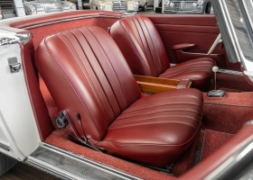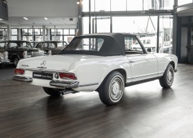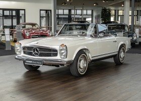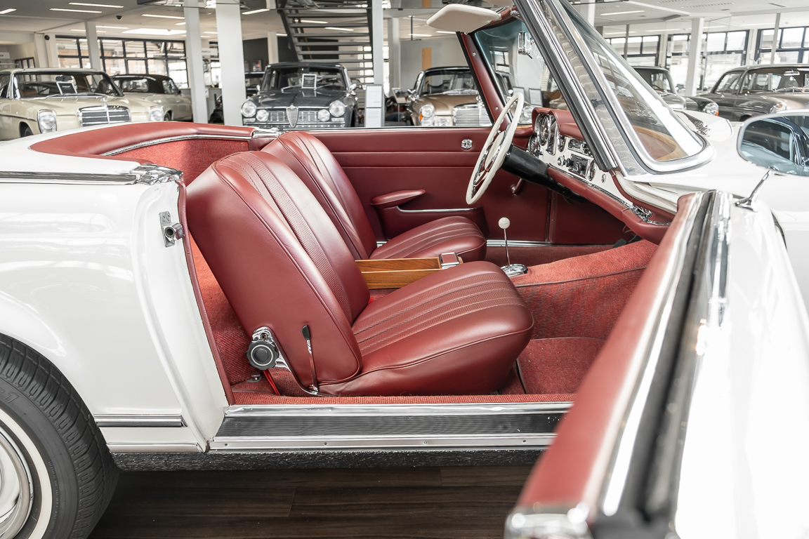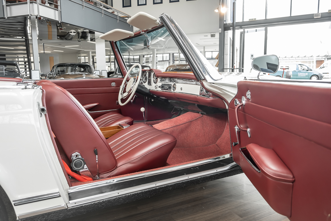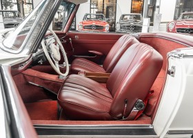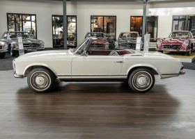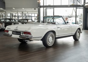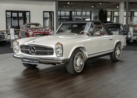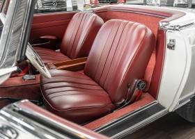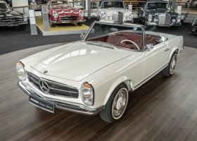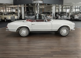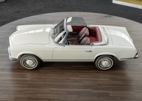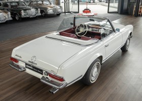 This elegant Mercedes-Benz 230SL Pagoda from 1966 was delivered to its first owner in sunny California/USA. The delivery color was 050 white in combination with red leather. In 2011 we acquired the car in Emeryville, a small town in Alameda County in the state of California/USA. The substance of the now 45-year-old Pagoda was excellent. Nevertheless, due to quality considerations, we decided to extensively overhaul the car. In this process, the interior of the car, which was getting on in years, was also renewed by our upholsterer in top quality. After completion in 2012 we sold the car to a lover of classic cars here in Lower Saxony. The car came regularly to us for service and received a new injection pump about 1 year ago. Unfortunately, the owner's busy schedule does not allow him much time to use the Pagoda. Just about 6,000 km came together in the last 10 years. So the previous owner has now decided to give the car into a new loving hand. We gladly took over the task of selling the car. We would be happy to show you the Pagoda in detail here in our showroom in Oldenburg, you will be thrilled.
