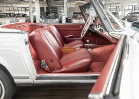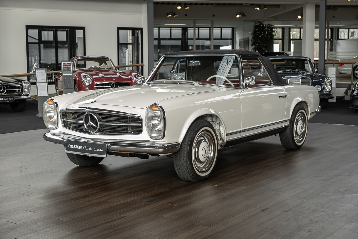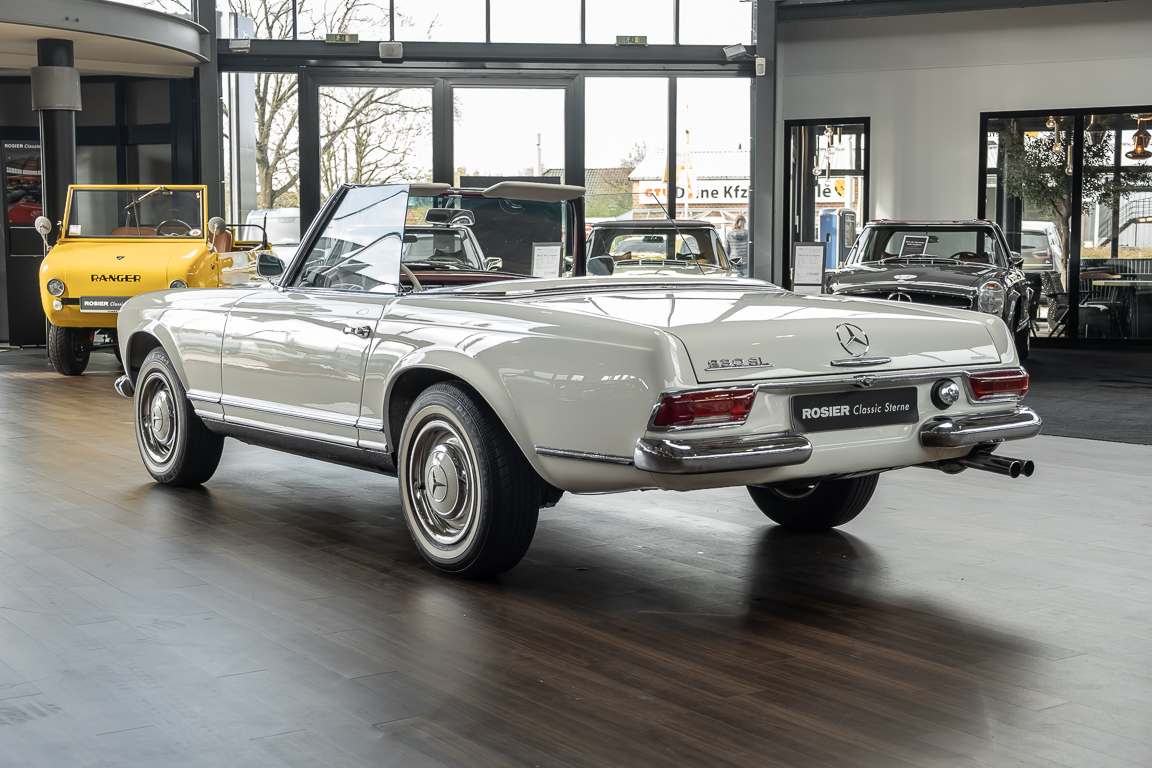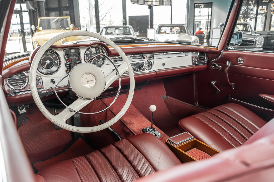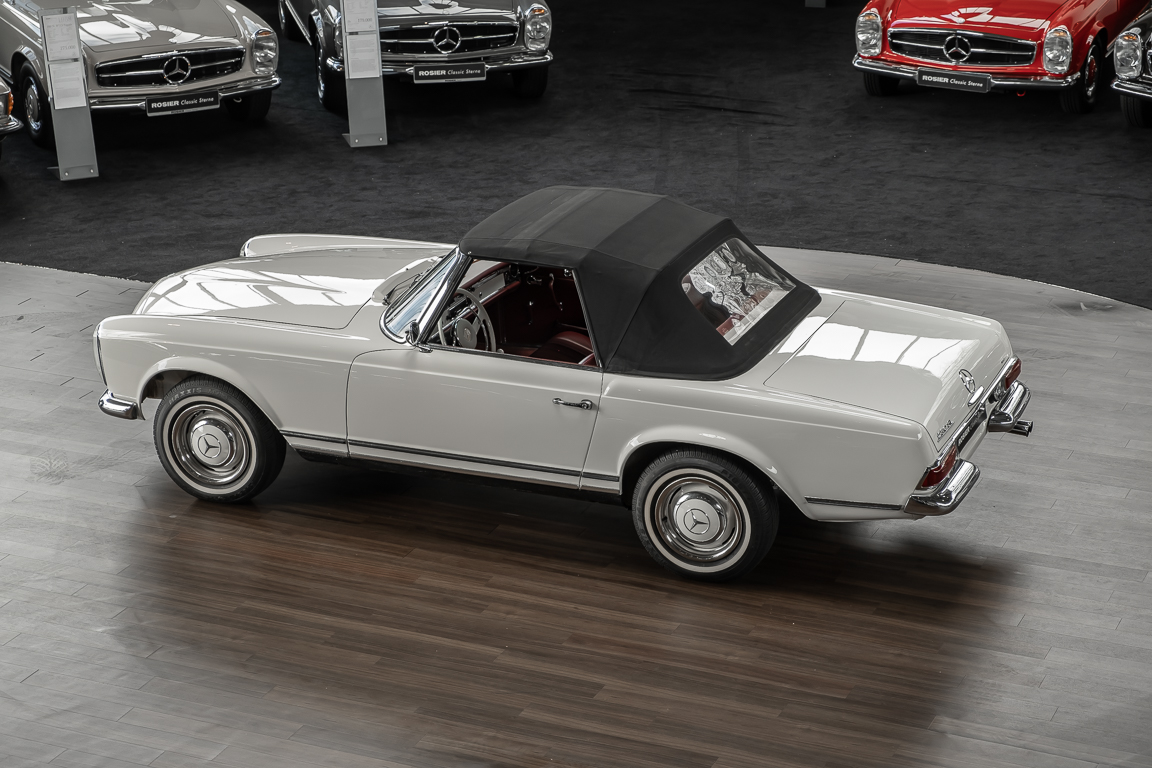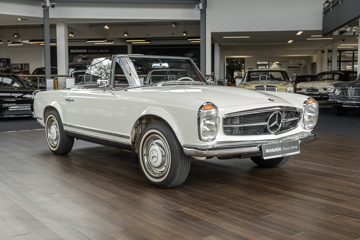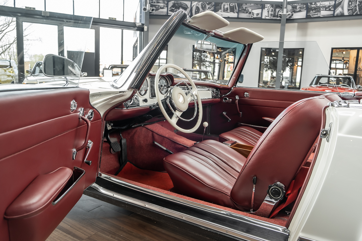 This elegant Mercedes-Benz 230SL Pagoda from 1966 was delivered to its first owner in sunny California/USA. The delivery color was 050 white in combination with red leather. In 2011 we acquired the car in Emeryville, a small town in Alameda County in the state of California/USA. The substance of the now 45-year-old Pagoda was excellent. Nevertheless, due to quality considerations, we decided to extensively overhaul the car. In this process, the interior of the car, which was getting on in years, was also renewed by our upholsterer in top quality. After completion in 2012 we sold the car to a lover of classic cars here in Lower Saxony. The car came regularly to us for service and received a new injection pump about 1 year ago. Unfortunately, the owner's busy schedule does not allow him much time to use the Pagoda. Just about 6,000 km came together in the last 10 years. So the previous owner has now decided to give the car into a new loving hand. We gladly took over the task of selling the car. We would be happy to show you the Pagoda in detail here in our showroom in Oldenburg, you will be thrilled.
