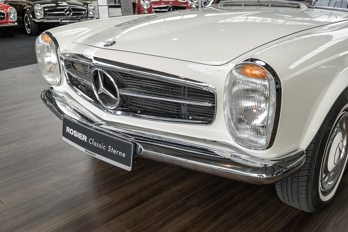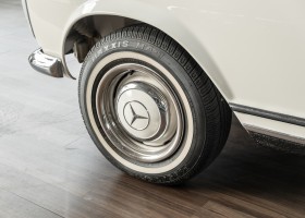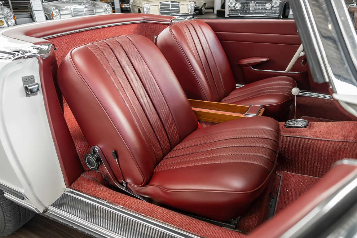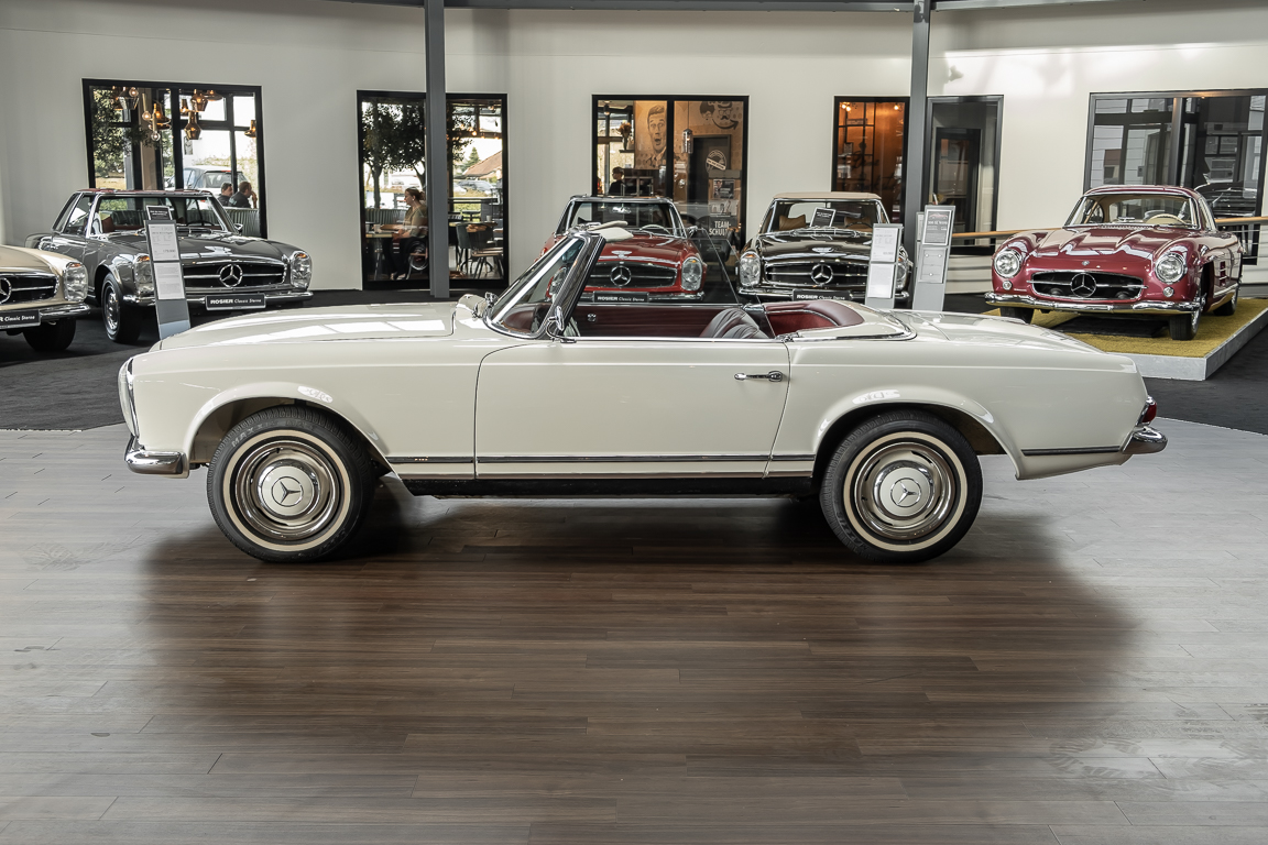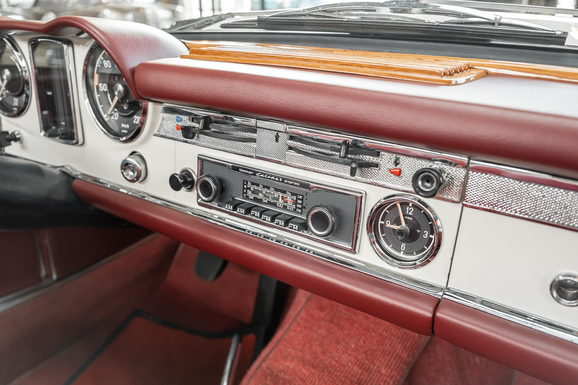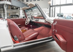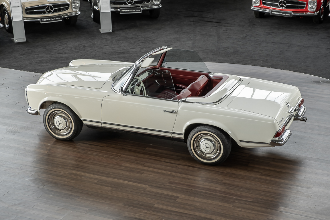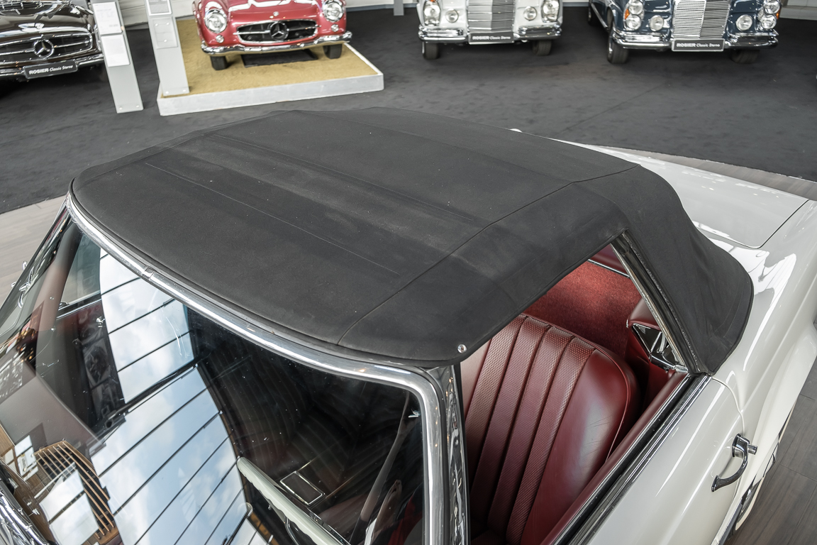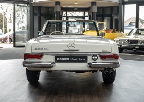 This elegant Mercedes-Benz 230SL Pagoda from 1966 was delivered to its first owner in sunny California/USA. The delivery color was 050 white in combination with red leather. In 2011 we acquired the car in Emeryville, a small town in Alameda County in the state of California/USA. The substance of the now 45-year-old Pagoda was excellent. Nevertheless, due to quality considerations, we decided to extensively overhaul the car. In this process, the interior of the car, which was getting on in years, was also renewed by our upholsterer in top quality. After completion in 2012 we sold the car to a lover of classic cars here in Lower Saxony. The car came regularly to us for service and received a new injection pump about 1 year ago. Unfortunately, the owner's busy schedule does not allow him much time to use the Pagoda. Just about 6,000 km came together in the last 10 years. So the previous owner has now decided to give the car into a new loving hand. We gladly took over the task of selling the car. We would be happy to show you the Pagoda in detail here in our showroom in Oldenburg, you will be thrilled.
