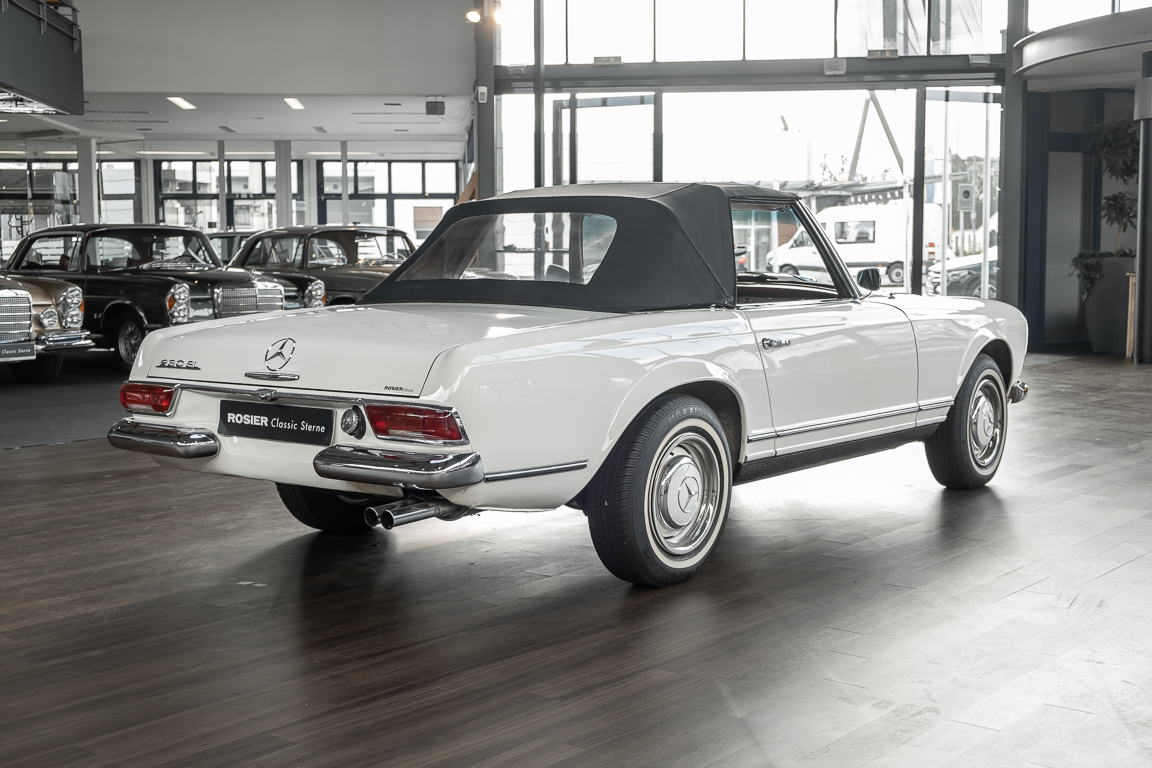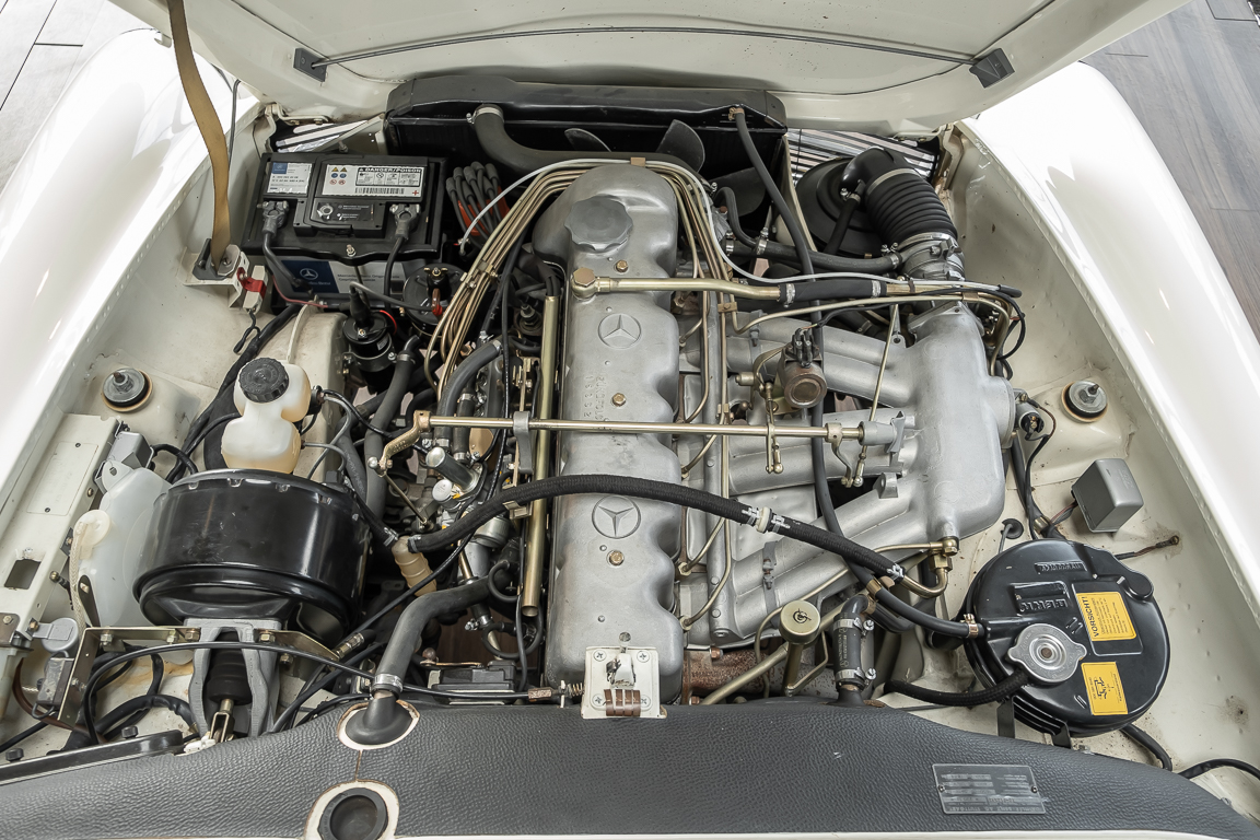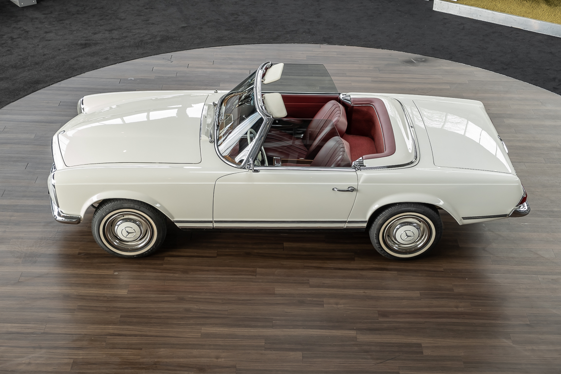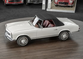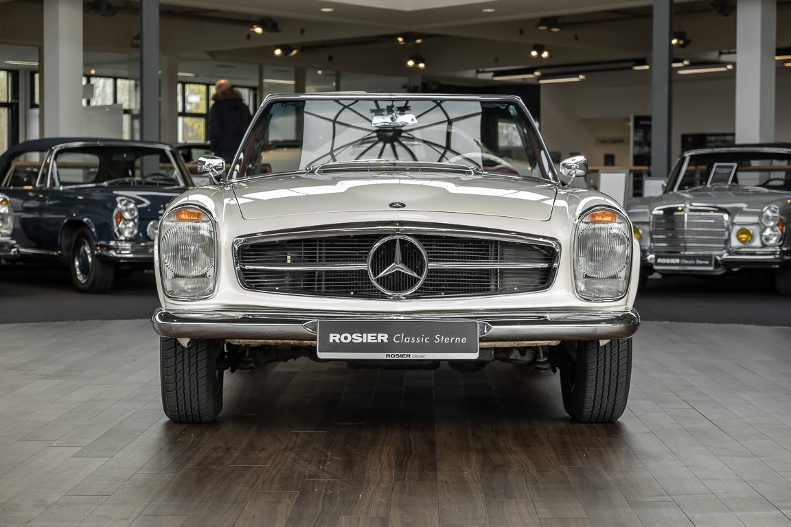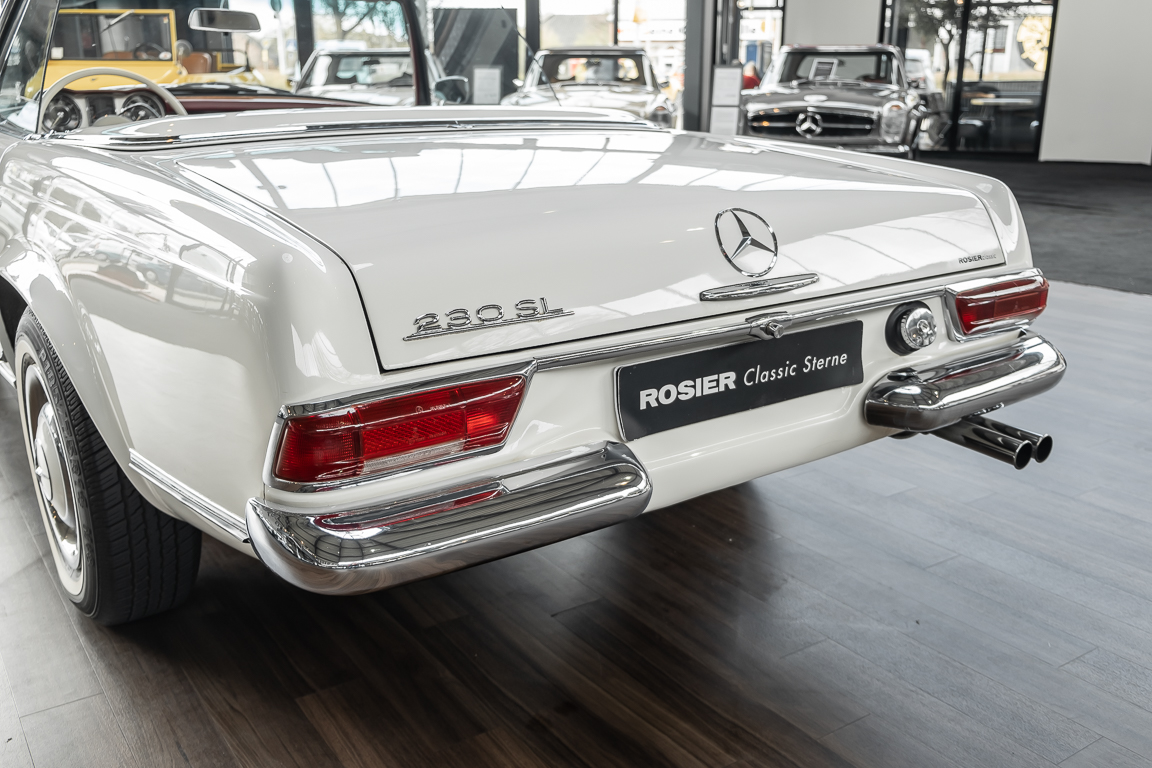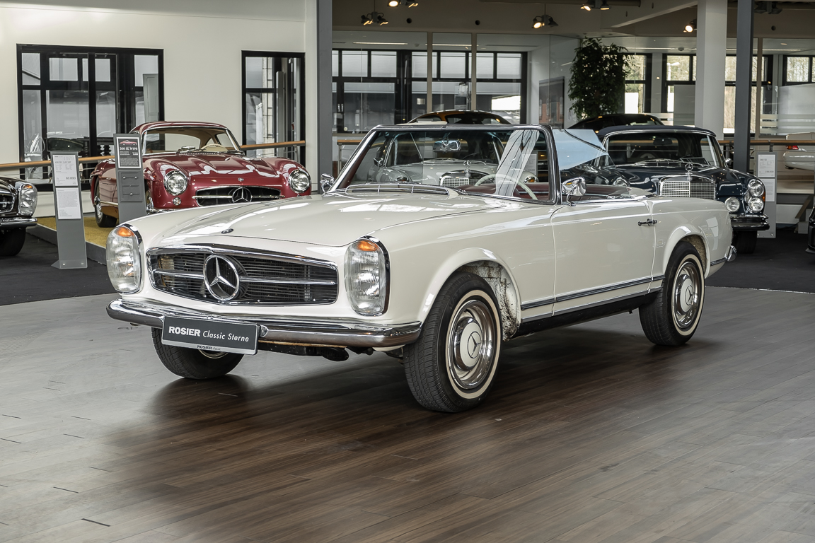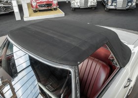 This elegant Mercedes-Benz 230SL Pagoda from 1966 was delivered to its first owner in sunny California/USA. The delivery color was 050 white in combination with red leather. In 2011 we acquired the car in Emeryville, a small town in Alameda County in the state of California/USA. The substance of the now 45-year-old Pagoda was excellent. Nevertheless, due to quality considerations, we decided to extensively overhaul the car. In this process, the interior of the car, which was getting on in years, was also renewed by our upholsterer in top quality. After completion in 2012 we sold the car to a lover of classic cars here in Lower Saxony. The car came regularly to us for service and received a new injection pump about 1 year ago. Unfortunately, the owner's busy schedule does not allow him much time to use the Pagoda. Just about 6,000 km came together in the last 10 years. So the previous owner has now decided to give the car into a new loving hand. We gladly took over the task of selling the car. We would be happy to show you the Pagoda in detail here in our showroom in Oldenburg, you will be thrilled.