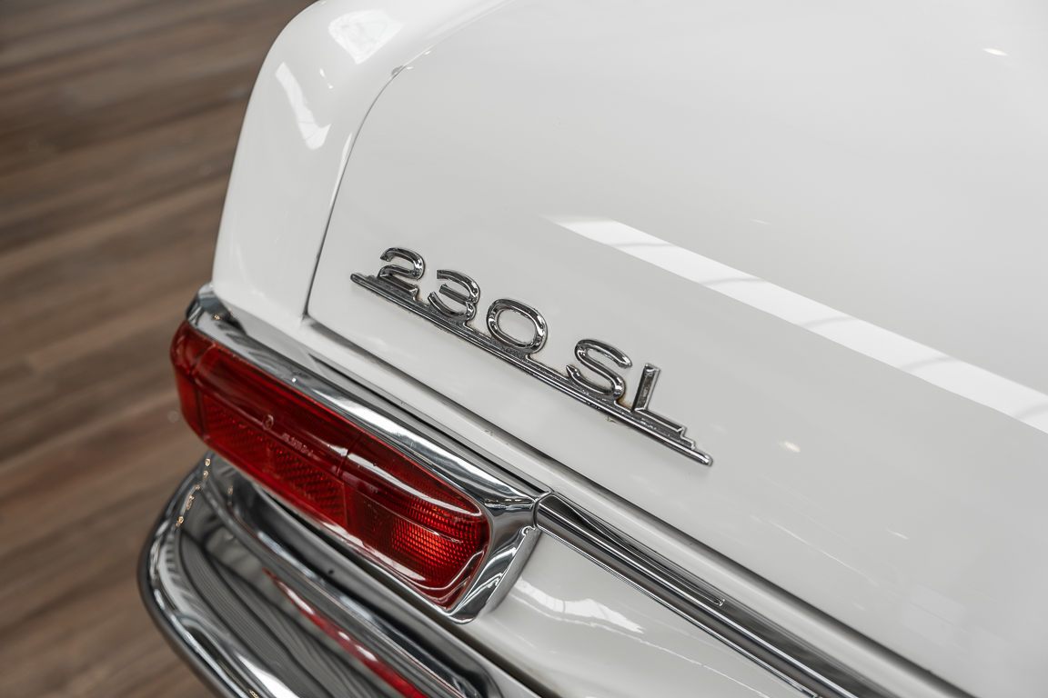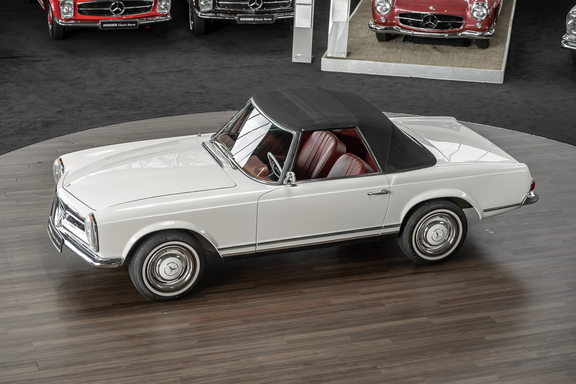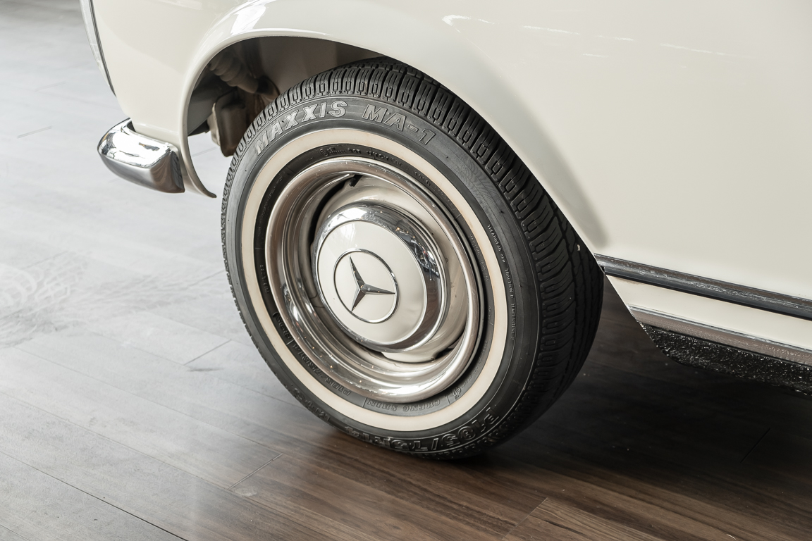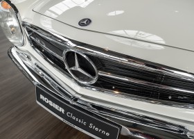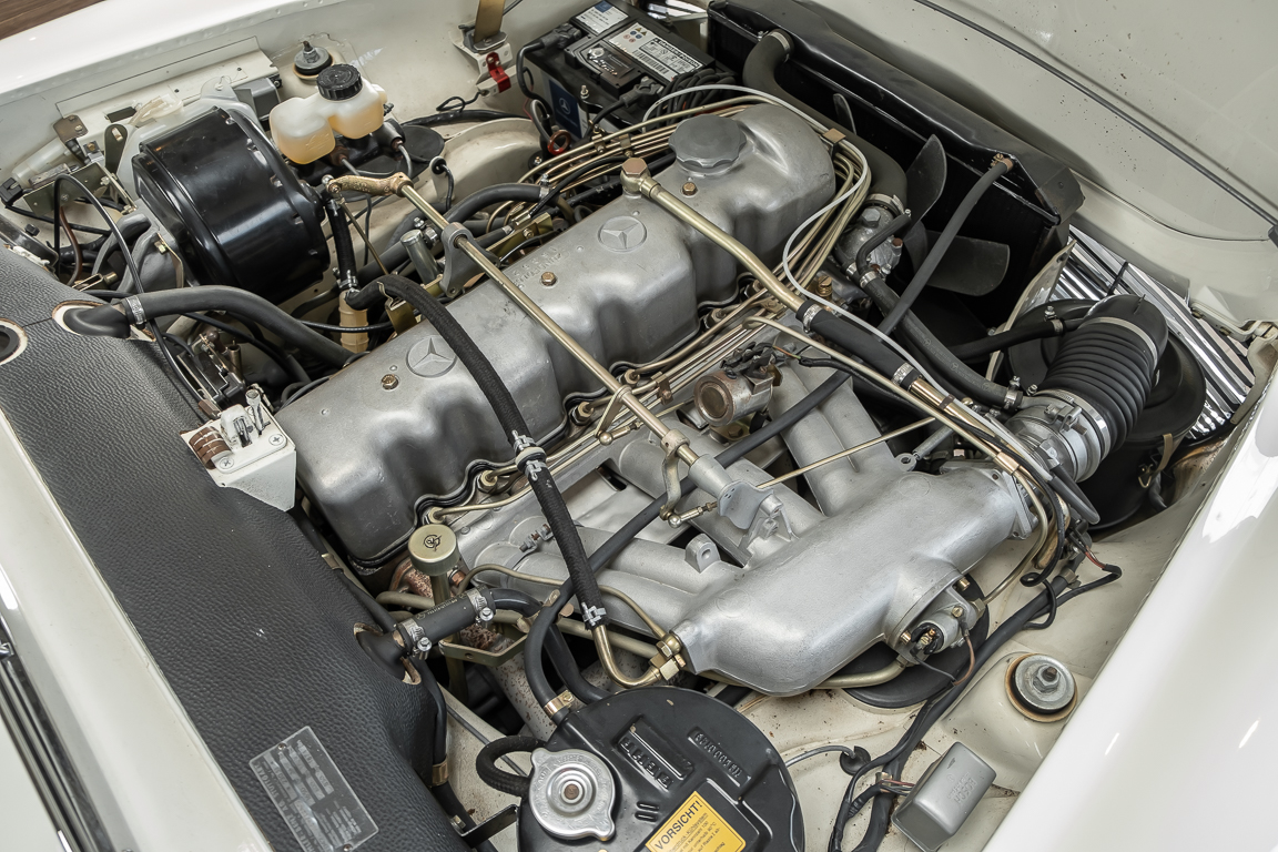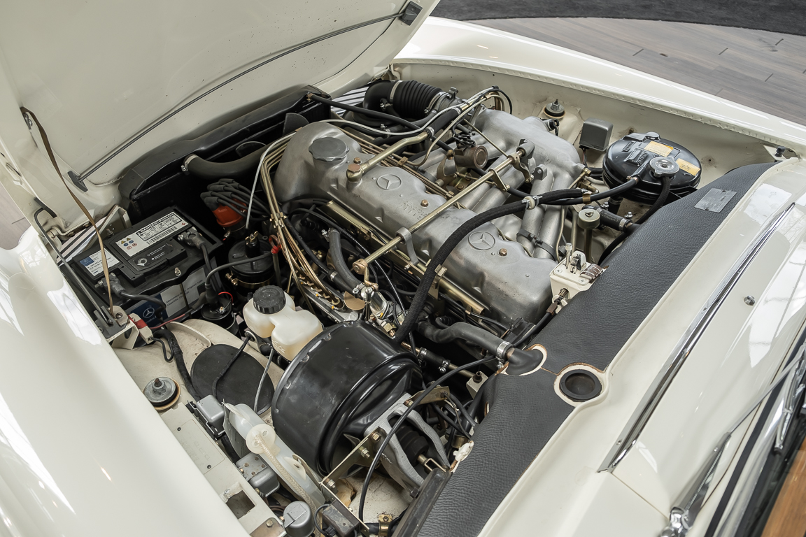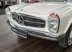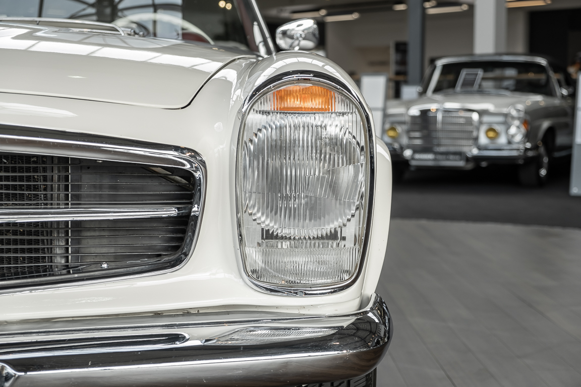 This elegant Mercedes-Benz 230SL Pagoda from 1966 was delivered to its first owner in sunny California/USA. The delivery color was 050 white in combination with red leather. In 2011 we acquired the car in Emeryville, a small town in Alameda County in the state of California/USA. The substance of the now 45-year-old Pagoda was excellent. Nevertheless, due to quality considerations, we decided to extensively overhaul the car. In this process, the interior of the car, which was getting on in years, was also renewed by our upholsterer in top quality. After completion in 2012 we sold the car to a lover of classic cars here in Lower Saxony. The car came regularly to us for service and received a new injection pump about 1 year ago. Unfortunately, the owner's busy schedule does not allow him much time to use the Pagoda. Just about 6,000 km came together in the last 10 years. So the previous owner has now decided to give the car into a new loving hand. We gladly took over the task of selling the car. We would be happy to show you the Pagoda in detail here in our showroom in Oldenburg, you will be thrilled.