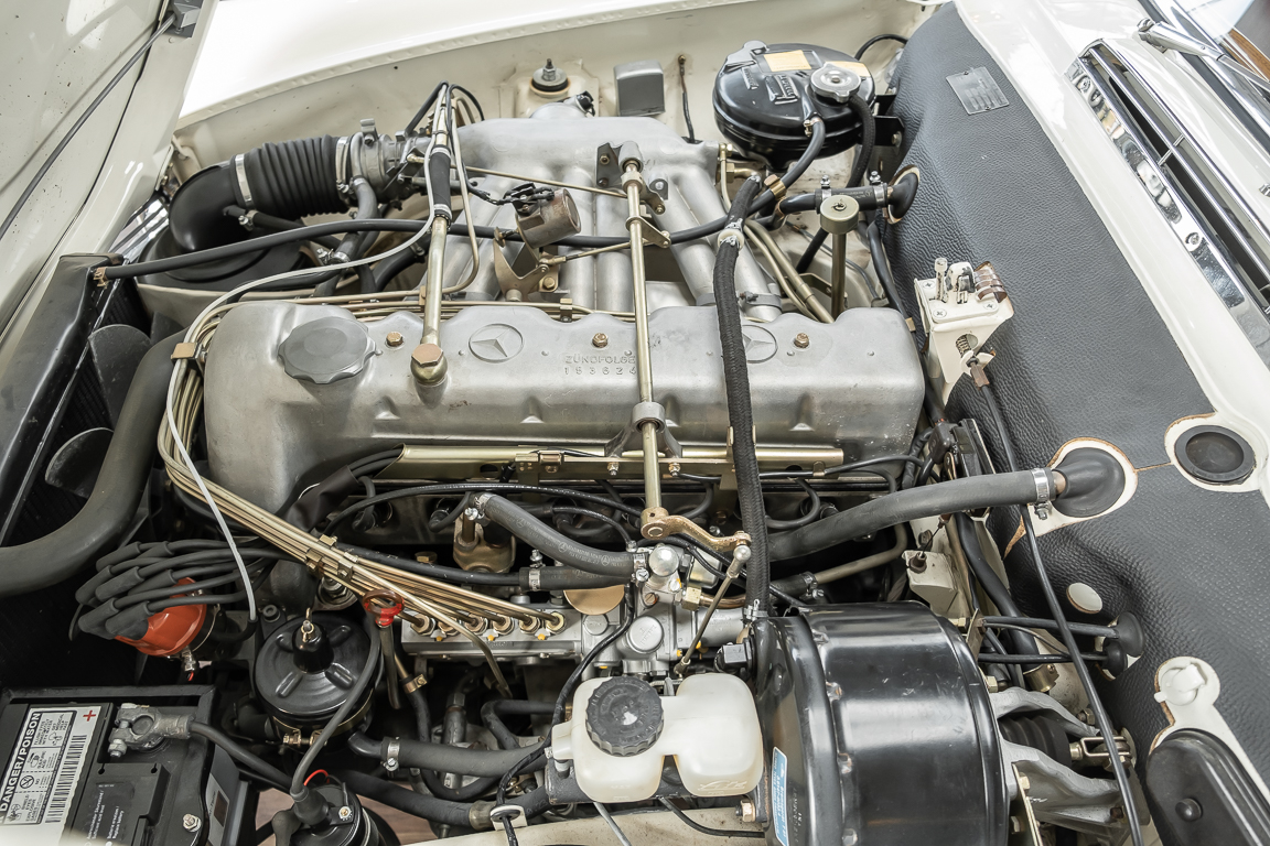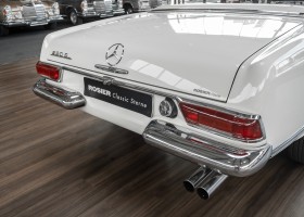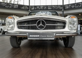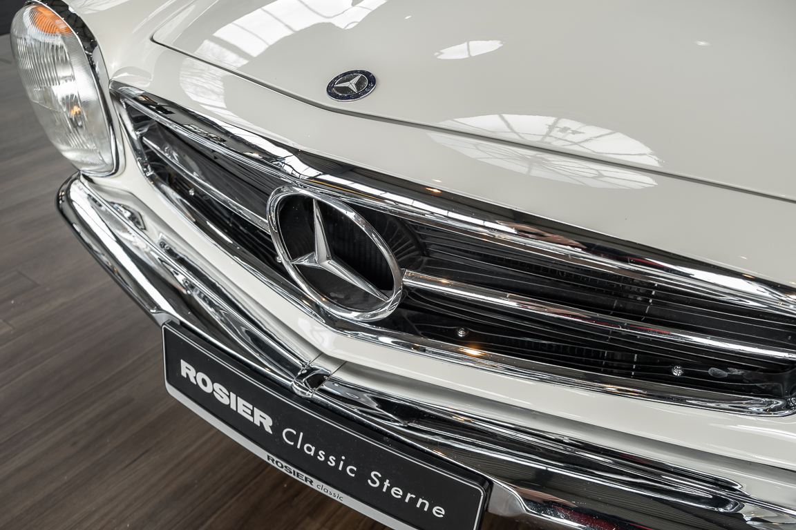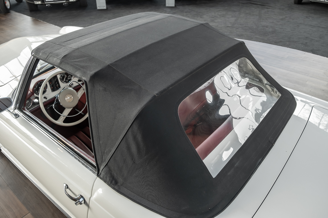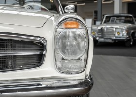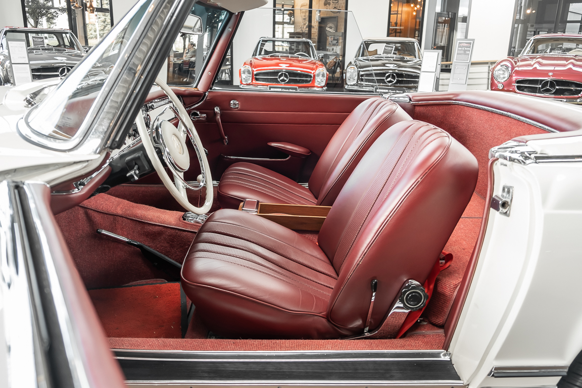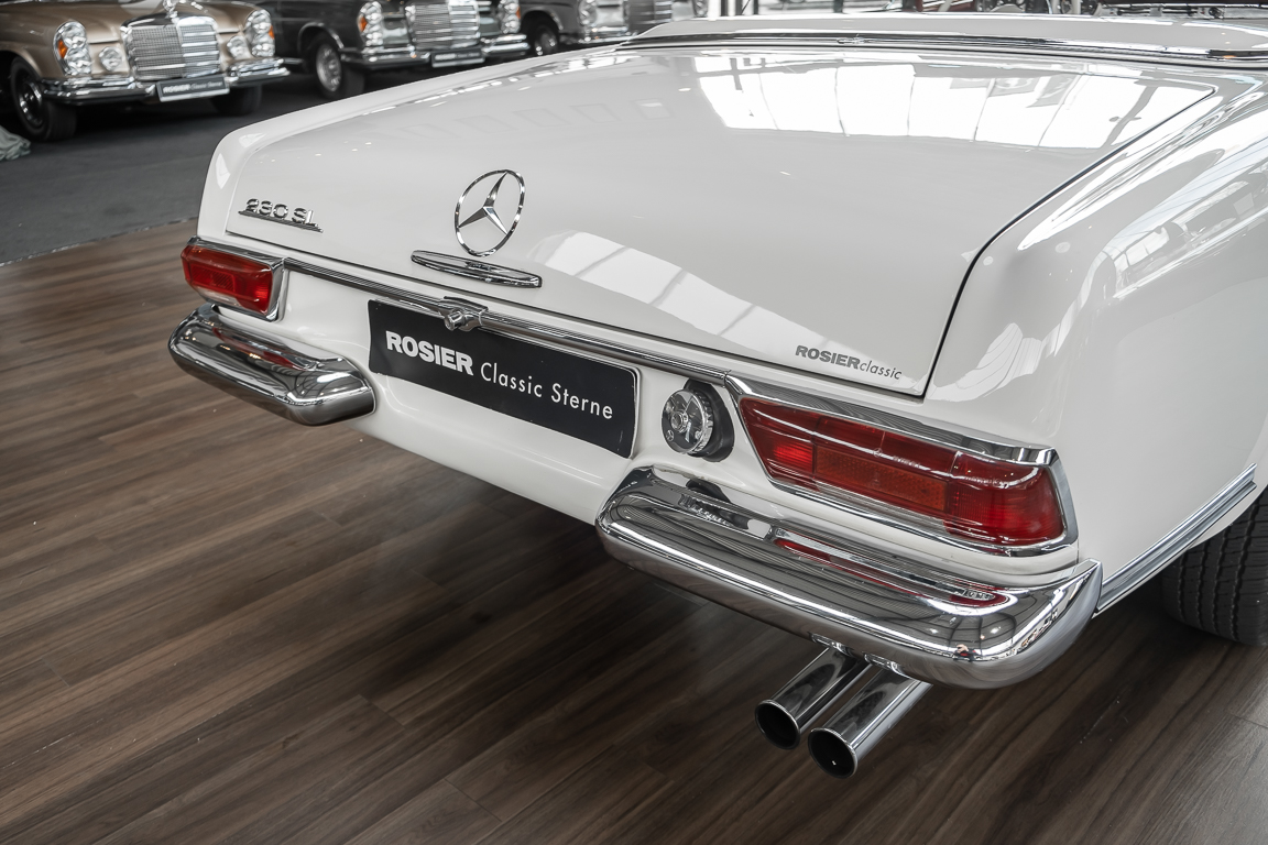 This elegant Mercedes-Benz 230SL Pagoda from 1966 was delivered to its first owner in sunny California/USA. The delivery color was 050 white in combination with red leather. In 2011 we acquired the car in Emeryville, a small town in Alameda County in the state of California/USA. The substance of the now 45-year-old Pagoda was excellent. Nevertheless, due to quality considerations, we decided to extensively overhaul the car. In this process, the interior of the car, which was getting on in years, was also renewed by our upholsterer in top quality. After completion in 2012 we sold the car to a lover of classic cars here in Lower Saxony. The car came regularly to us for service and received a new injection pump about 1 year ago. Unfortunately, the owner's busy schedule does not allow him much time to use the Pagoda. Just about 6,000 km came together in the last 10 years. So the previous owner has now decided to give the car into a new loving hand. We gladly took over the task of selling the car. We would be happy to show you the Pagoda in detail here in our showroom in Oldenburg, you will be thrilled.