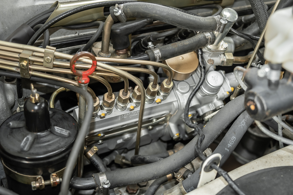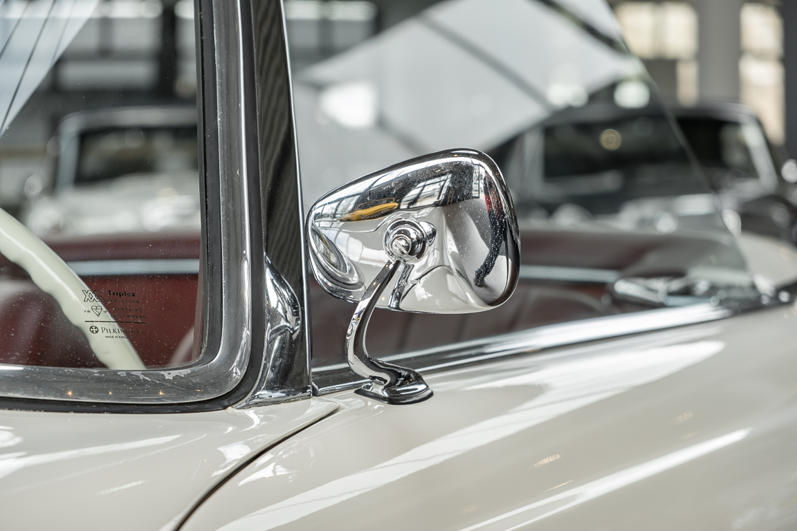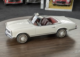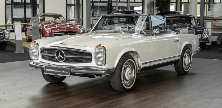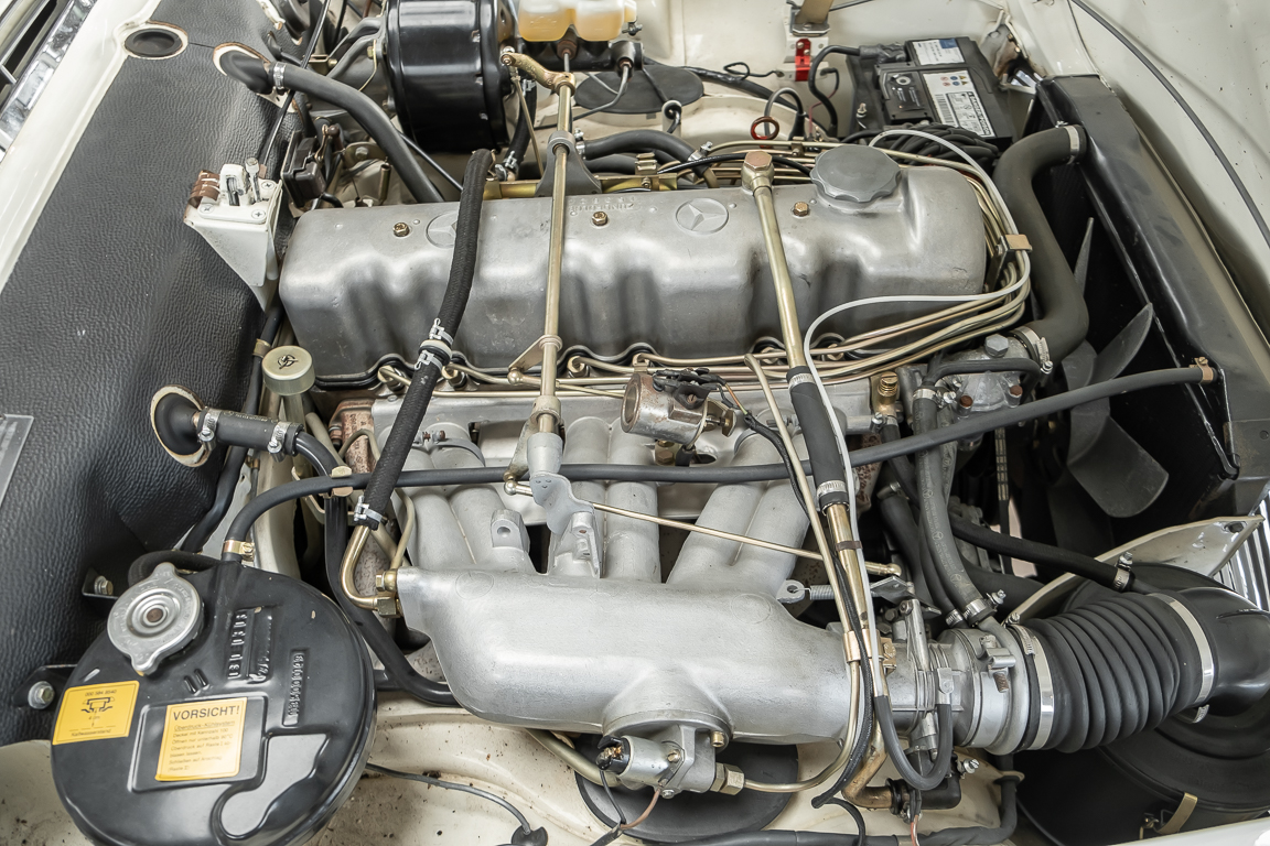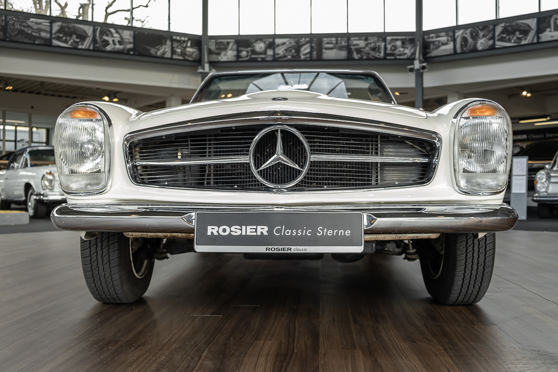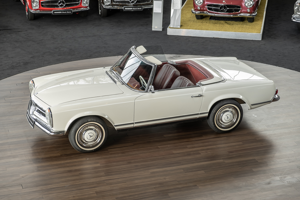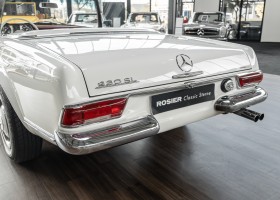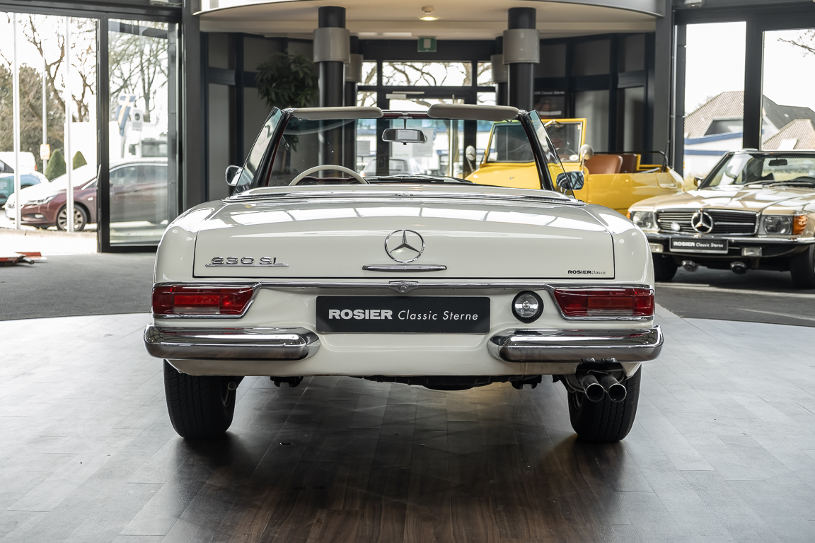This elegant Mercedes-Benz 230SL Pagoda from 1966 was delivered to its first owner in sunny California/USA. The delivery color was 050 white in combination with red leather. In 2011 we acquired the car in Emeryville, a small town in Alameda County in the state of California/USA. The substance of the now 45-year-old Pagoda was excellent. Nevertheless, due to quality considerations, we decided to extensively overhaul the car. In this process, the interior of the car, which was getting on in years, was also renewed by our upholsterer in top quality. After completion in 2012 we sold the car to a lover of classic cars here in Lower Saxony. The car came regularly to us for service and received a new injection pump about 1 year ago. Unfortunately, the owner's busy schedule does not allow him much time to use the Pagoda. Just about 6,000 km came together in the last 10 years. So the previous owner has now decided to give the car into a new loving hand. We gladly took over the task of selling the car. We would be happy to show you the Pagoda in detail here in our showroom in Oldenburg, you will be thrilled.