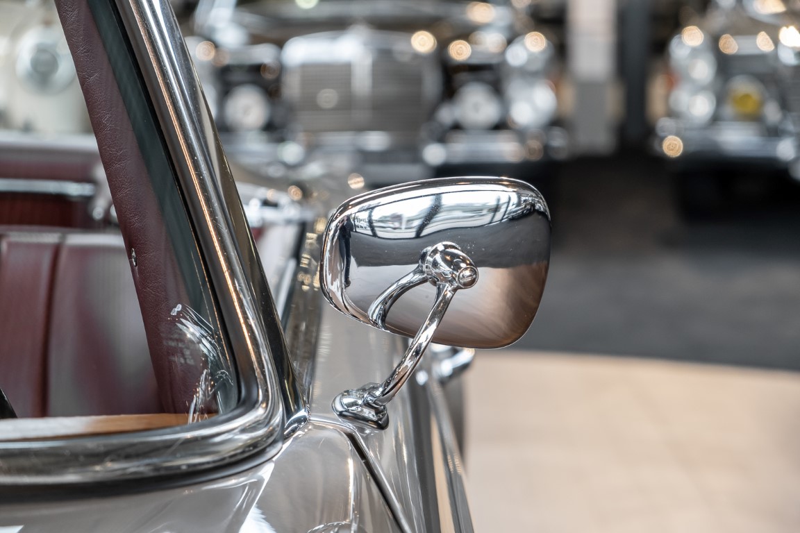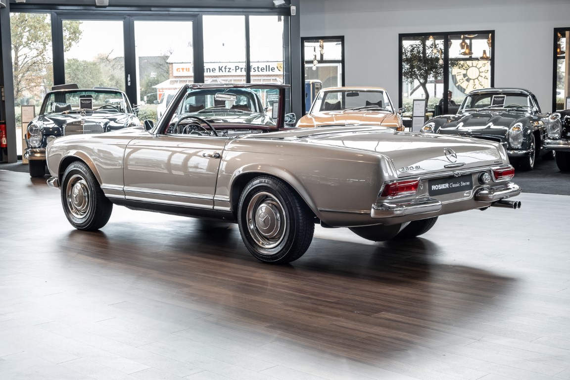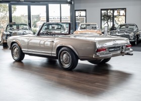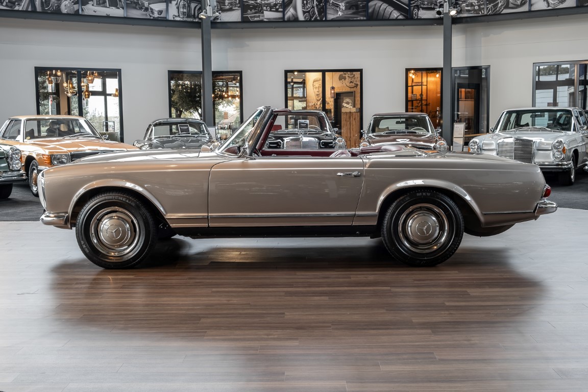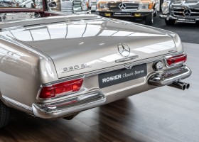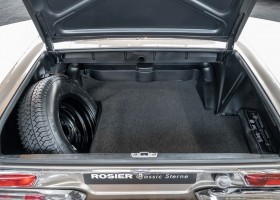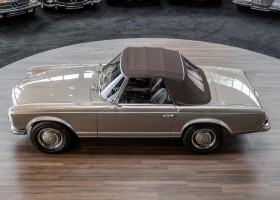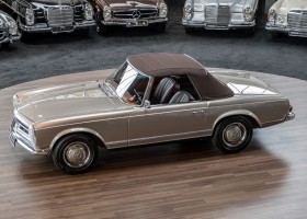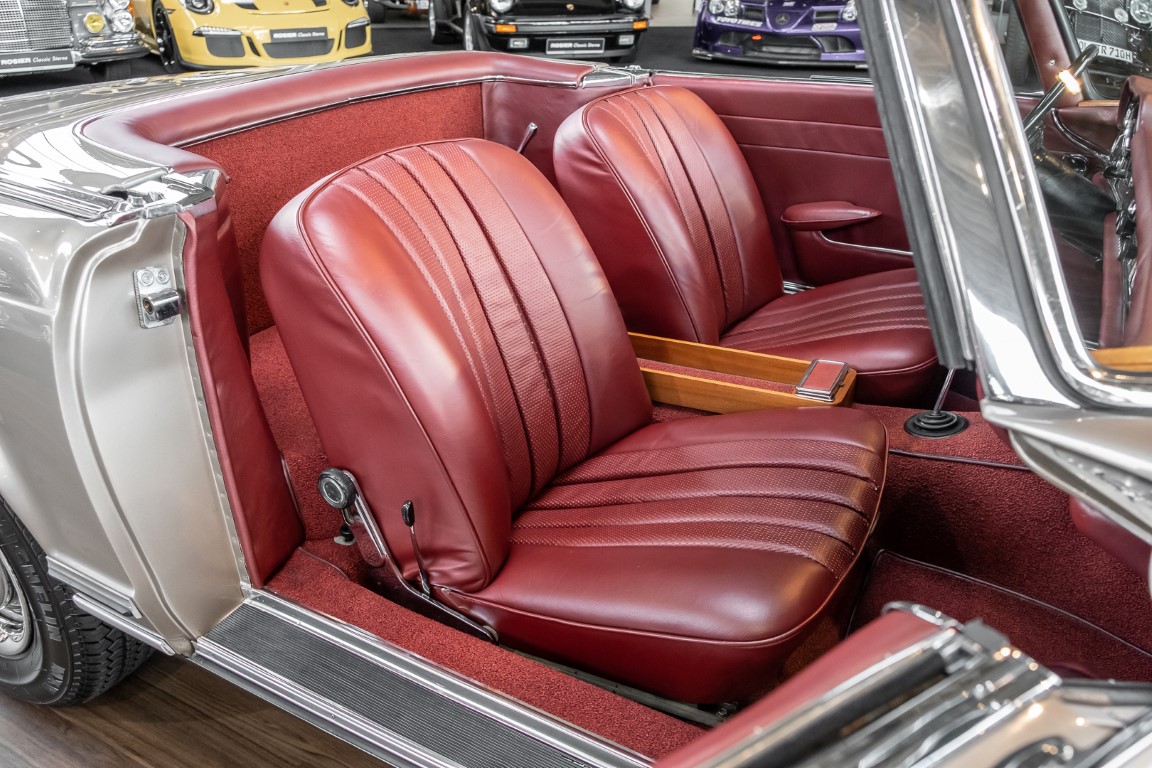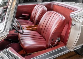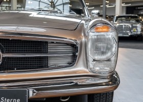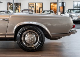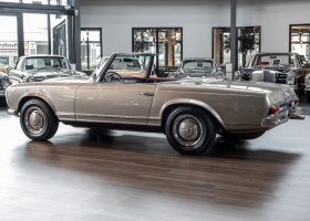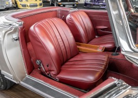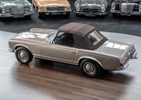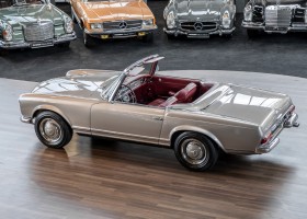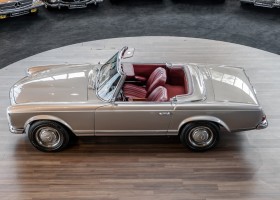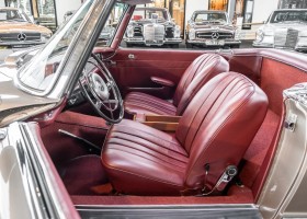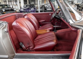Here the car underwent a complete restoration: the body was completely stripped of all paint and received a new paint finish in the wonderfully matching color Beige Grey Metallic (DB 728). The engine, the transmission and the axles were overhauled. All auxiliary units were overhauled and renewed where necessary. A new interior in Bordeaux color and a new fabric top in Mercedes quality were installed. A power steering and color glass were retrofitted. In our manufactory, the vehicle had to undergo the strict glances of our specialists, who put their hands on the underbody of the vehicle once again to put the finishing touches on it.