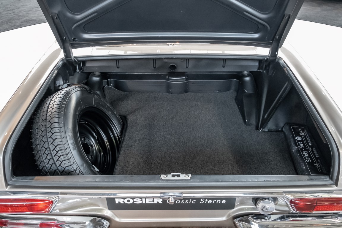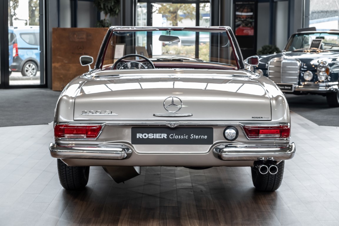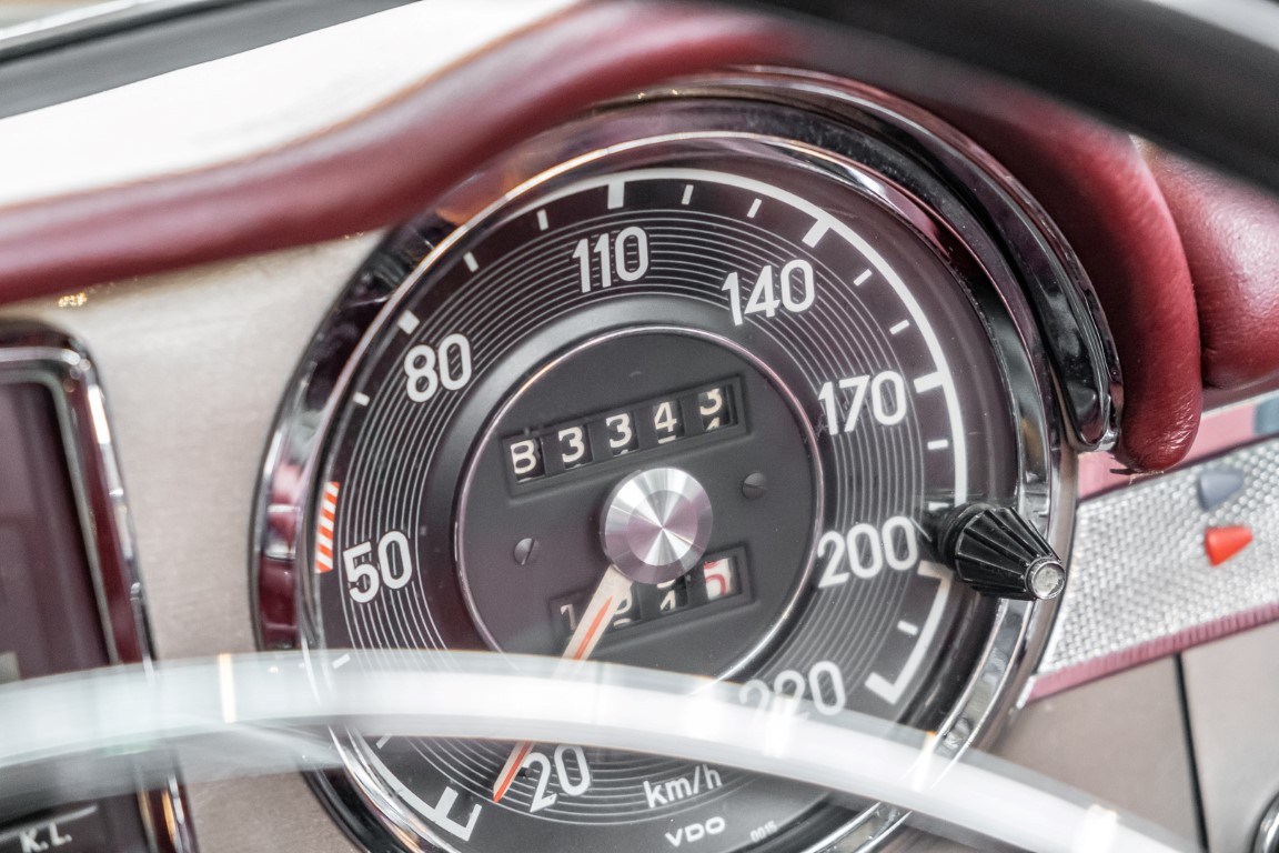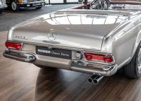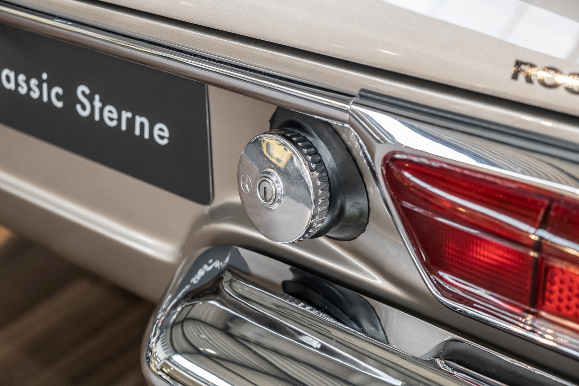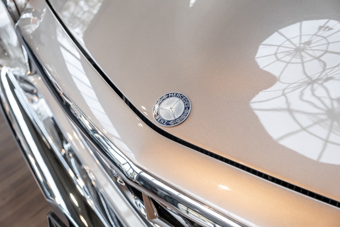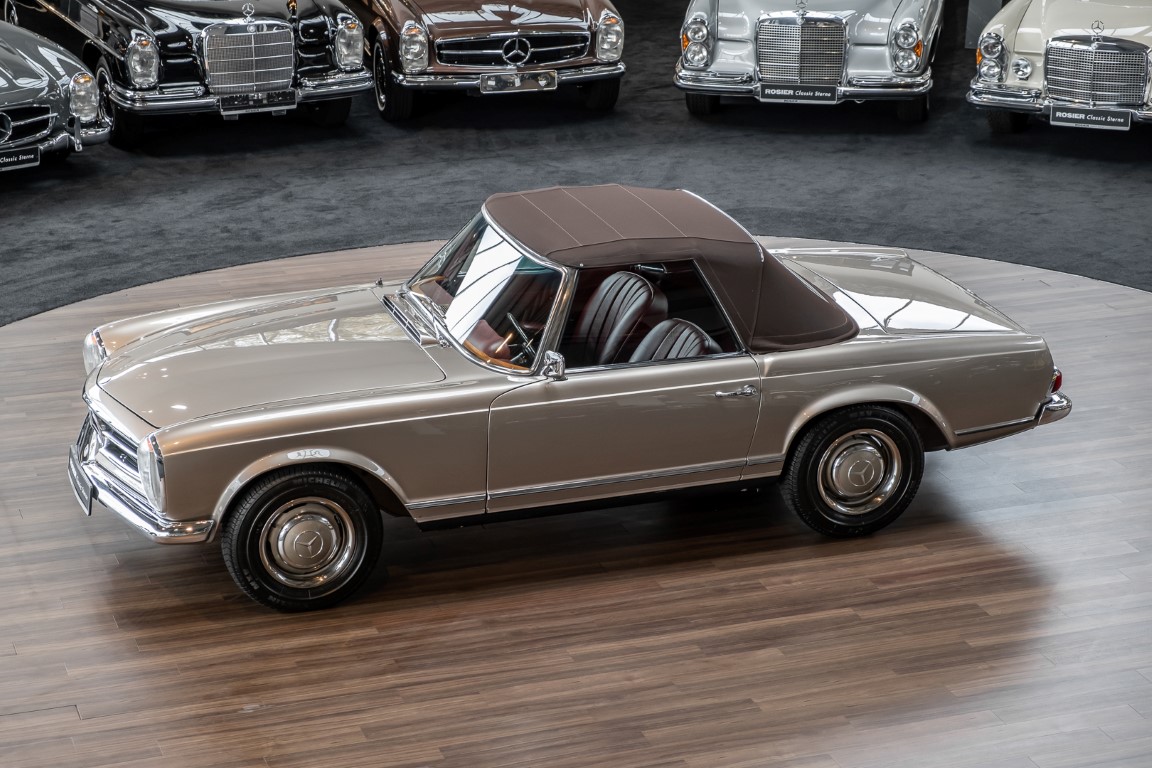 Here the car underwent a complete restoration: the body was completely stripped of all paint and received a new paint finish in the wonderfully matching color Beige Grey Metallic (DB 728). The engine, the transmission and the axles were overhauled. All auxiliary units were overhauled and renewed where necessary. A new interior in Bordeaux color and a new fabric top in Mercedes quality were installed. A power steering and color glass were retrofitted. In our manufactory, the vehicle had to undergo the strict glances of our specialists, who put their hands on the underbody of the vehicle once again to put the finishing touches on it.