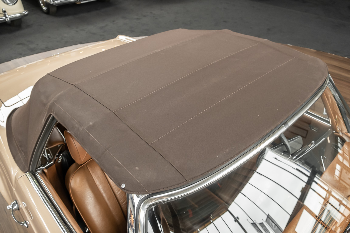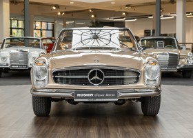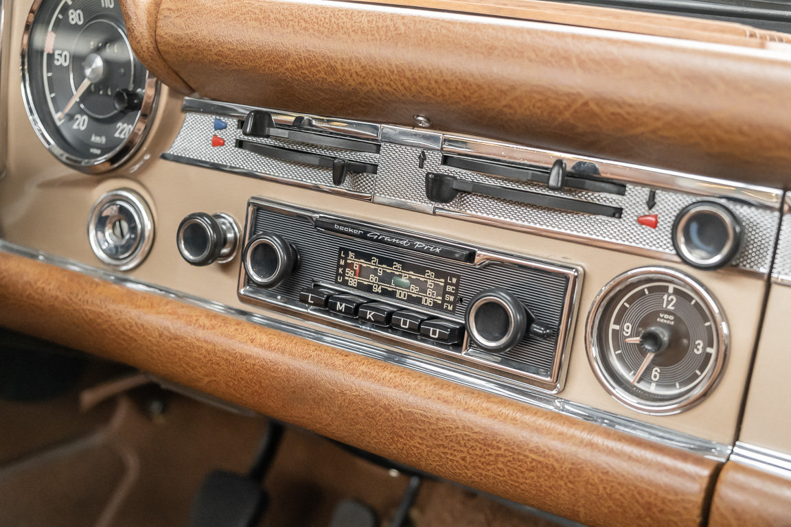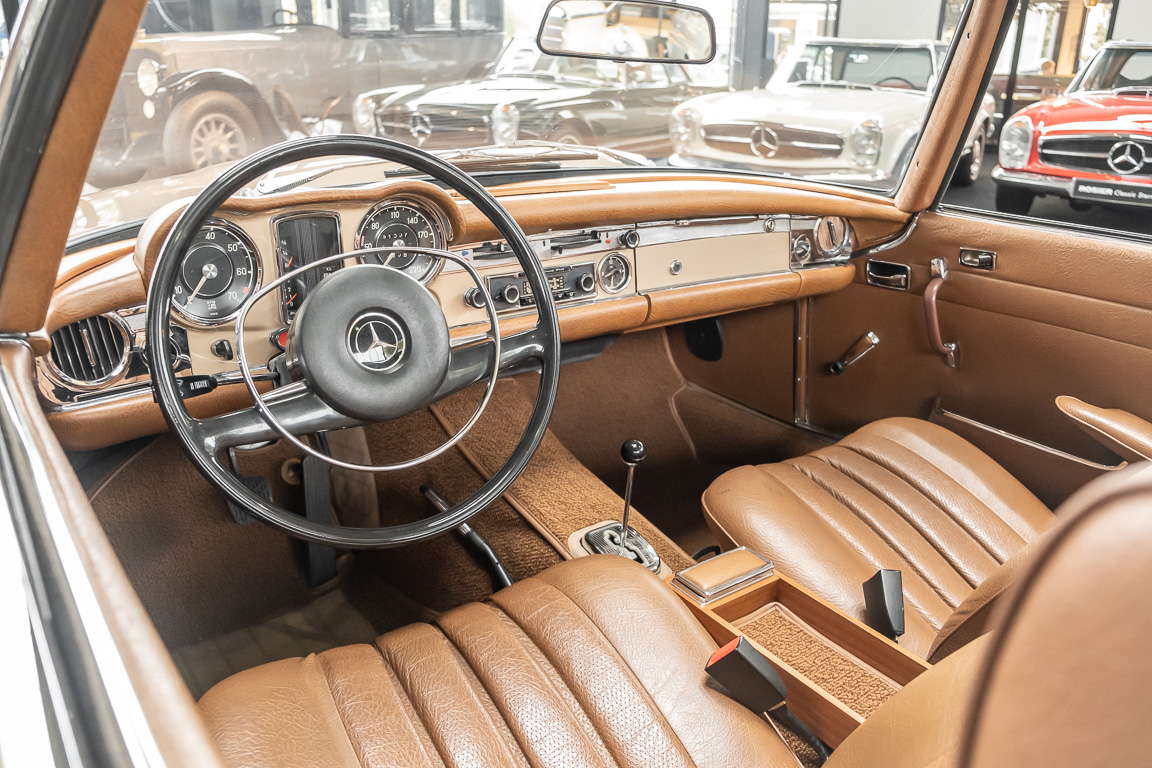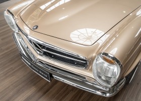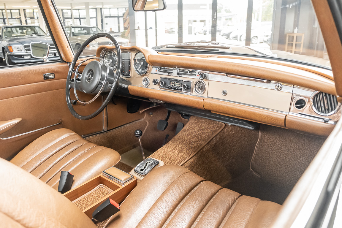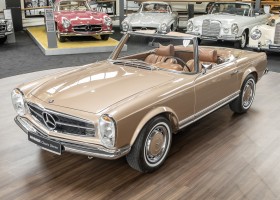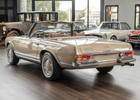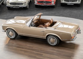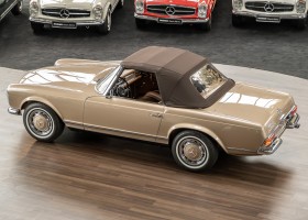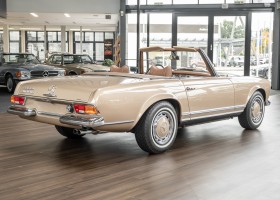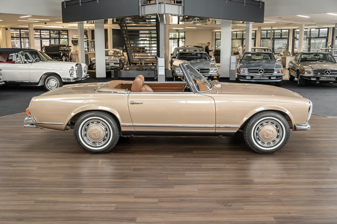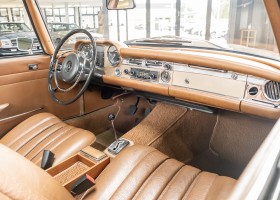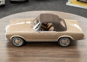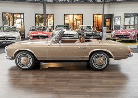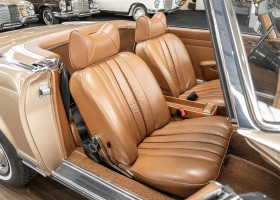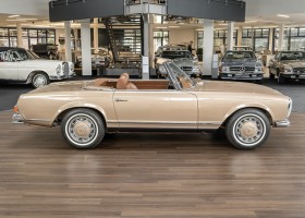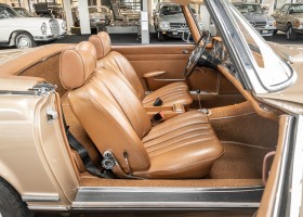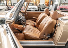 The offered Mercedes-Benz 280SL Pagoda was completed in 1969 in the Mercedes factory and delivered to the USA. The elegant color scheme in Sand Beige Metallic in combination with cognac-colored interior emphasized the elegant appearance to a very special extent even at that time. In March 1972, the car was sold by its first owner to London, Great Britain. It came into the possession of a diplomat's family who lived next to Primrose Hill not far from the wonderfully beautiful Regent's Park, in an elegant area of London. Presumably it was the lady of the house who used the car in London and in Geneva, Switzerland. After about 30 years of ownership, the family decided to sell the Pagoda. So in February 2001, a Swiss restaurateur from picturesque Fribourg in western Switzerland took over the Pagoda. During his ownership, a factory exchange engine was installed at an authorized Mercedes-Benz partner in July 2001. The original invoice for just under CHF 30,000 is available. In 2003 the car was acquired by a German manufacturer for his collection. He had the Pagoda professionally overhauled where necessary and restored it to its current dream condition. After almost 20 years in collector's possession and care, the chic roadster is to get a new home. Take your chance on a solid vehicle, with a great traceable history. We are happy to advise you.