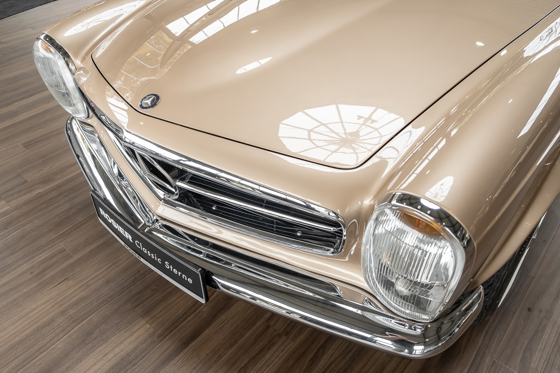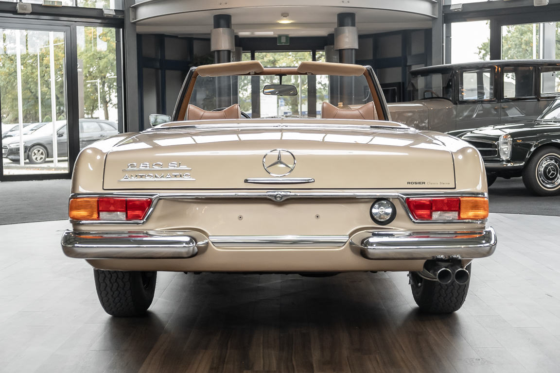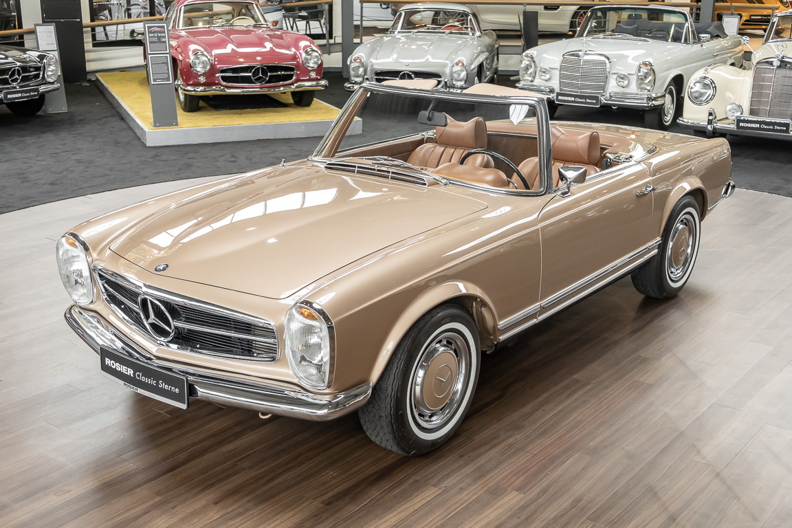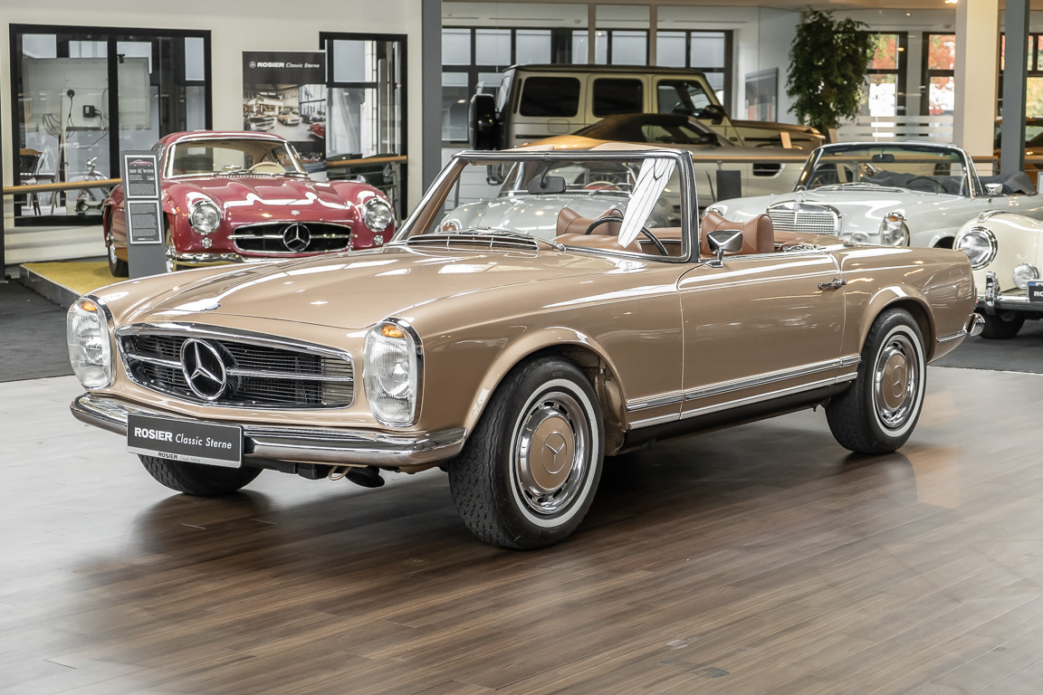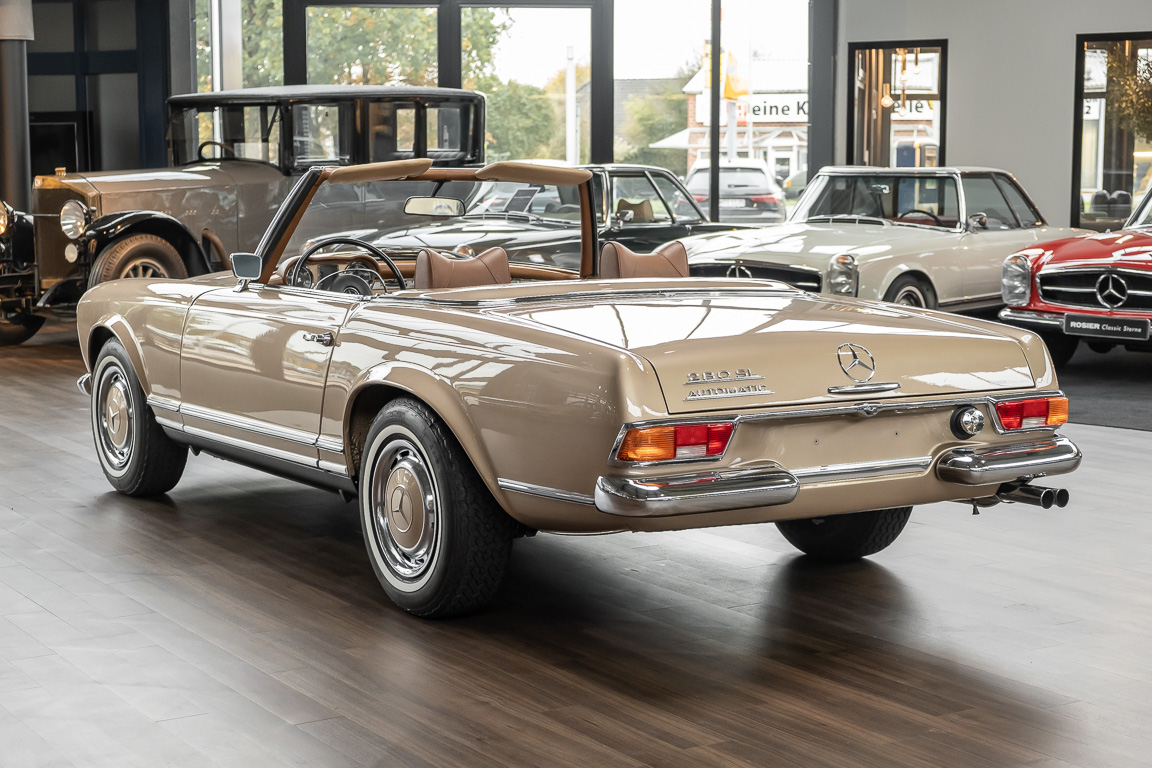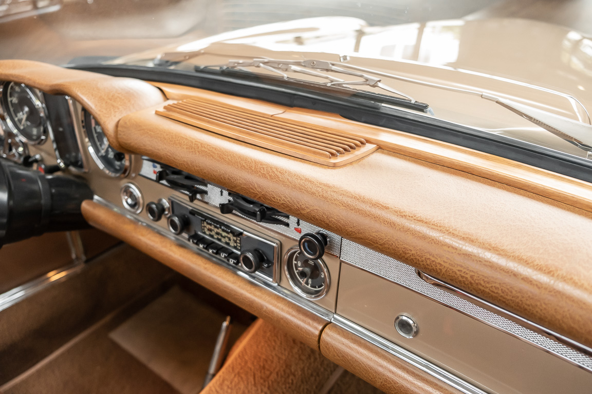 The offered Mercedes-Benz 280SL Pagoda was completed in 1969 in the Mercedes factory and delivered to the USA. The elegant color scheme in Sand Beige Metallic in combination with cognac-colored interior emphasized the elegant appearance to a very special extent even at that time. In March 1972, the car was sold by its first owner to London, Great Britain. It came into the possession of a diplomat's family who lived next to Primrose Hill not far from the wonderfully beautiful Regent's Park, in an elegant area of London. Presumably it was the lady of the house who used the car in London and in Geneva, Switzerland. After about 30 years of ownership, the family decided to sell the Pagoda. So in February 2001, a Swiss restaurateur from picturesque Fribourg in western Switzerland took over the Pagoda. During his ownership, a factory exchange engine was installed at an authorized Mercedes-Benz partner in July 2001. The original invoice for just under CHF 30,000 is available. In 2003 the car was acquired by a German manufacturer for his collection. He had the Pagoda professionally overhauled where necessary and restored it to its current dream condition. After almost 20 years in collector's possession and care, the chic roadster is to get a new home. Take your chance on a solid vehicle, with a great traceable history. We are happy to advise you.