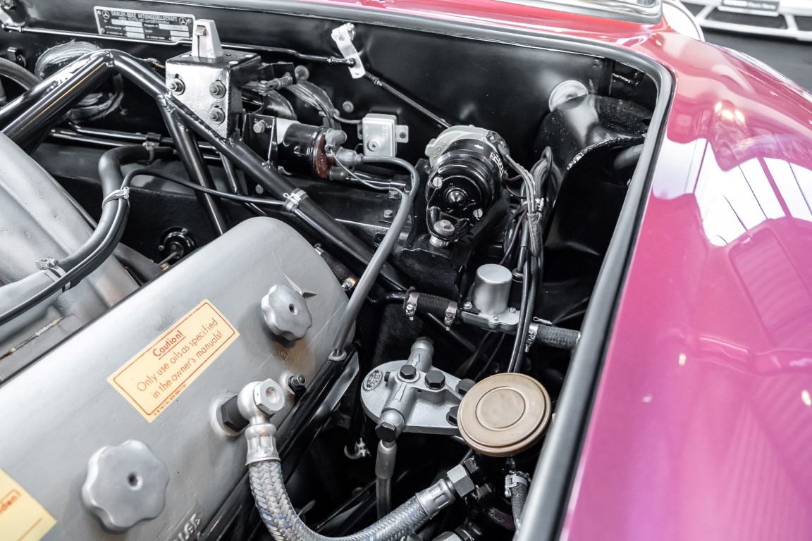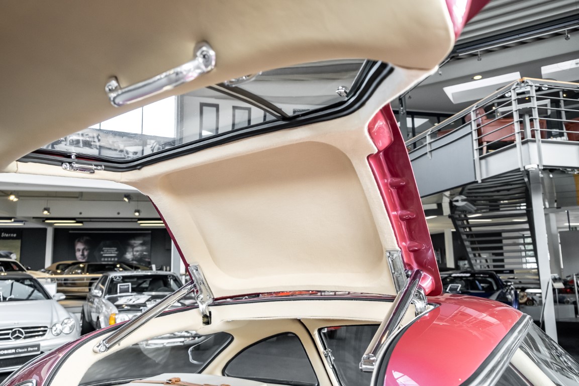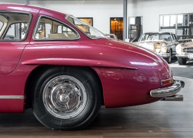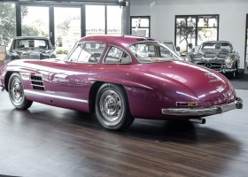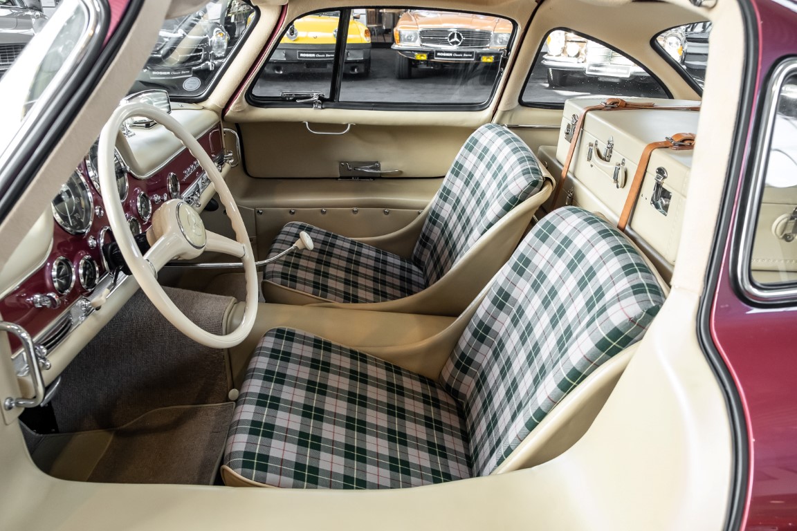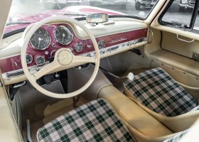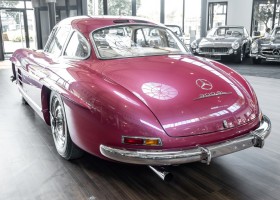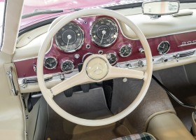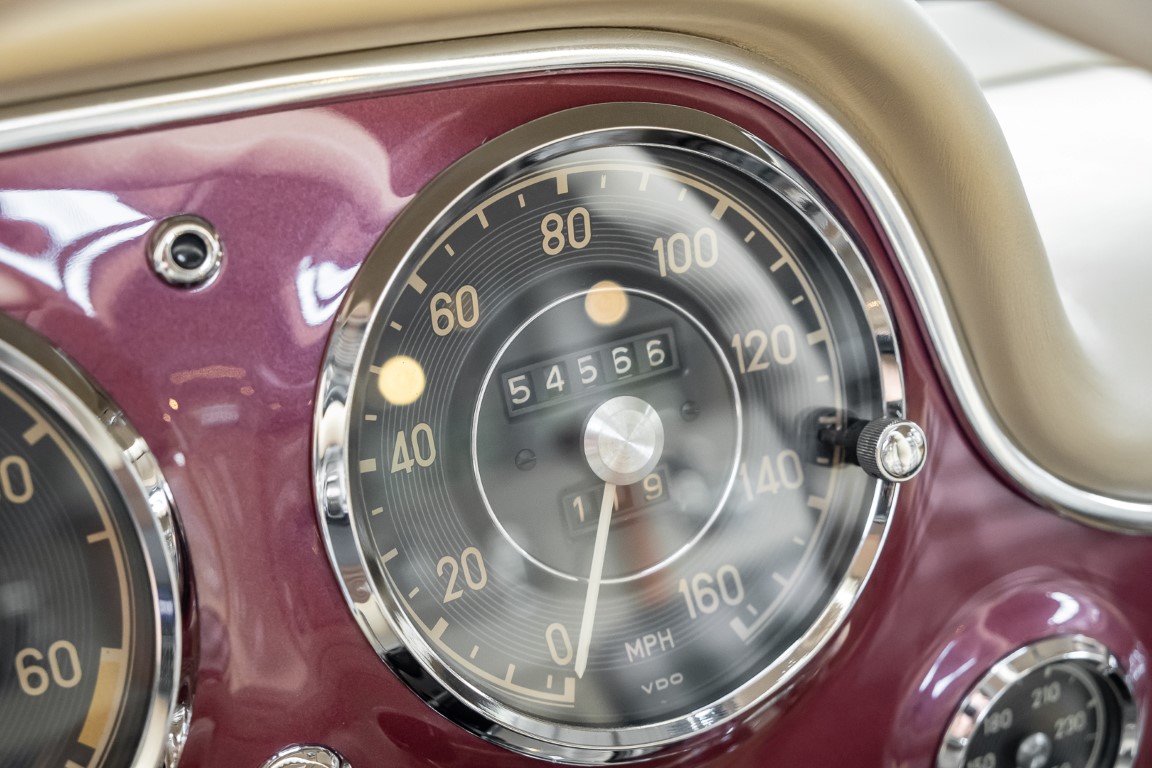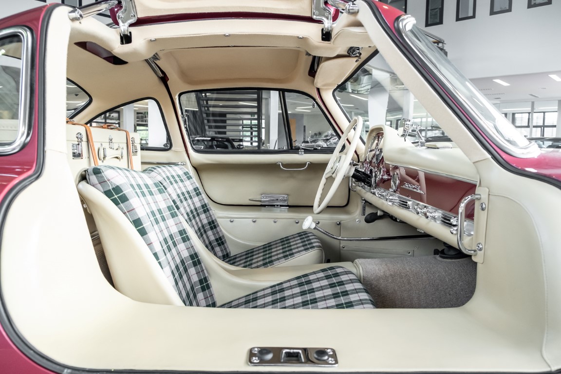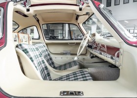 According to the Gullwing Group Registry, the first owner of Coupé No. 20 was Roy Miller of China Lake, USA. In the early 1970s, Weston Hook of La Jolla, California, became the owner, who cared for the car over the next four decades, eventually passing it on to his son. Weston Hook spent time in both California and Hawaii, the latter being the center of his real estate business, and so the car shuttled between the two sunny Pacific locations. After several decades of ownership and use, Hook commissioned Jerry Hjeltness, arguably the most renowned 300 SL restorer in Escondido, California, to perform a restoration, the results of which can be succinctly described as extraordinary. Over the course of two years and with great attention to detail, the wing with the number 20 was completely restored down to the smallest detail and painted in the contemporary Mercedes colors DB 543 Strawberry Red Metallic. The combination with beige leather interior and green checkered seats is stylish and extraordinary. Matching luggage and chrome Rudge wheels complete the undeniably beautiful appearance that attracts attention in any society. The result of this restoration has inevitably led to many concours wins in class and in entire showrooms. The car is simply a "best-of-the-best" restoration, by one of the best 300SL restorers.