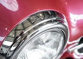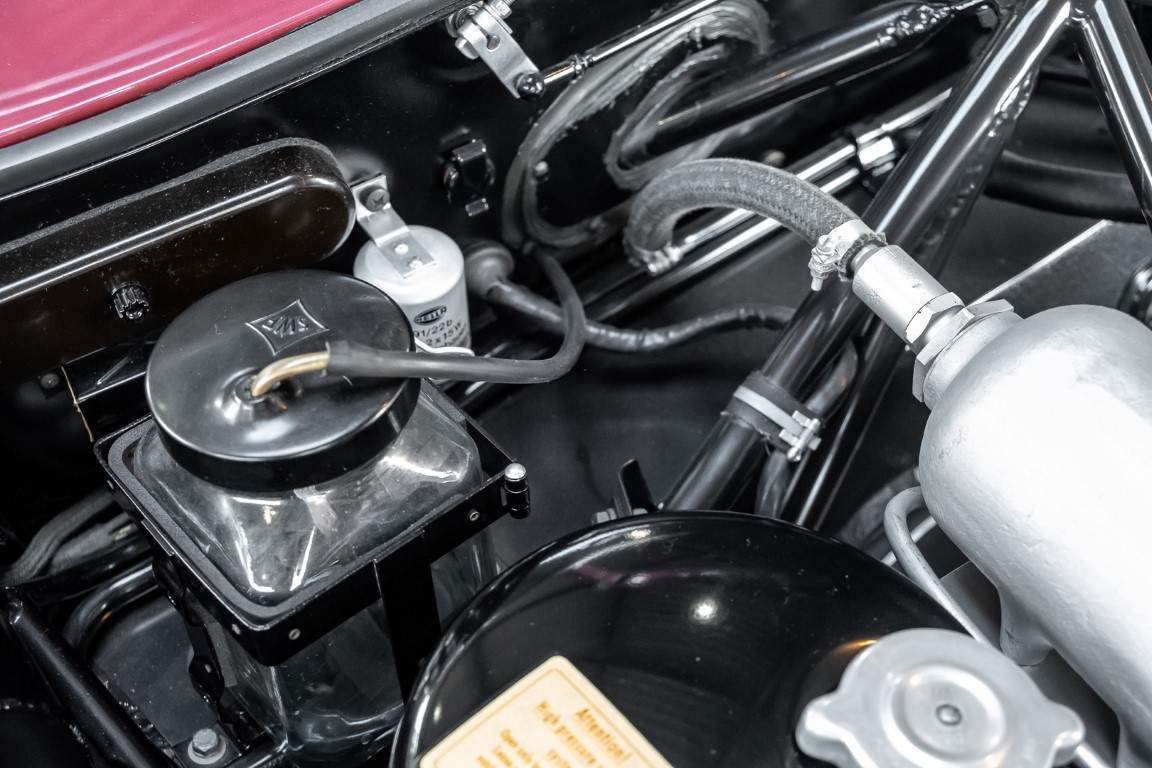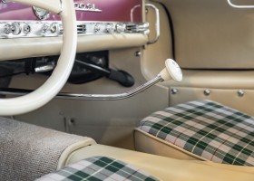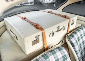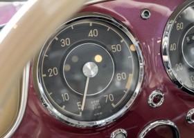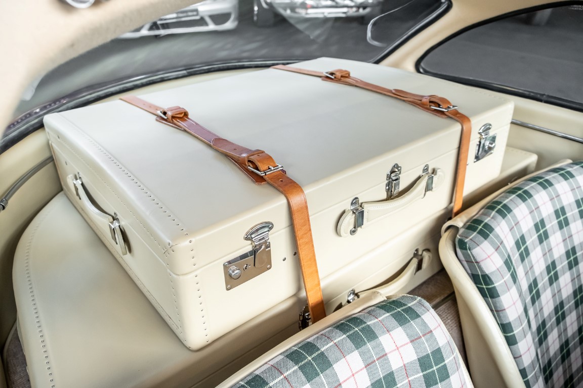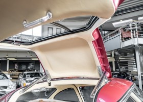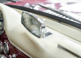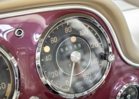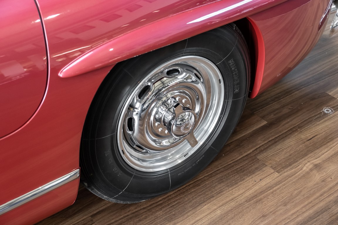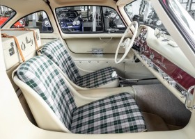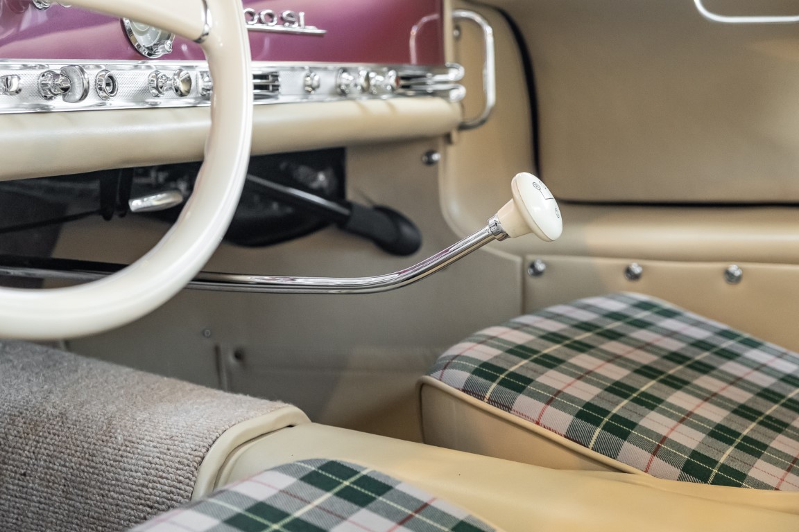According to the Gullwing Group Registry, the first owner of Coupé No. 20 was Roy Miller of China Lake, USA. In the early 1970s, Weston Hook of La Jolla, California, became the owner, who cared for the car over the next four decades, eventually passing it on to his son. Weston Hook spent time in both California and Hawaii, the latter being the center of his real estate business, and so the car shuttled between the two sunny Pacific locations. After several decades of ownership and use, Hook commissioned Jerry Hjeltness, arguably the most renowned 300 SL restorer in Escondido, California, to perform a restoration, the results of which can be succinctly described as extraordinary. Over the course of two years and with great attention to detail, the wing with the number 20 was completely restored down to the smallest detail and painted in the contemporary Mercedes colors DB 543 Strawberry Red Metallic. The combination with beige leather interior and green checkered seats is stylish and extraordinary. Matching luggage and chrome Rudge wheels complete the undeniably beautiful appearance that attracts attention in any society. The result of this restoration has inevitably led to many concours wins in class and in entire showrooms. The car is simply a "best-of-the-best" restoration, by one of the best 300SL restorers.