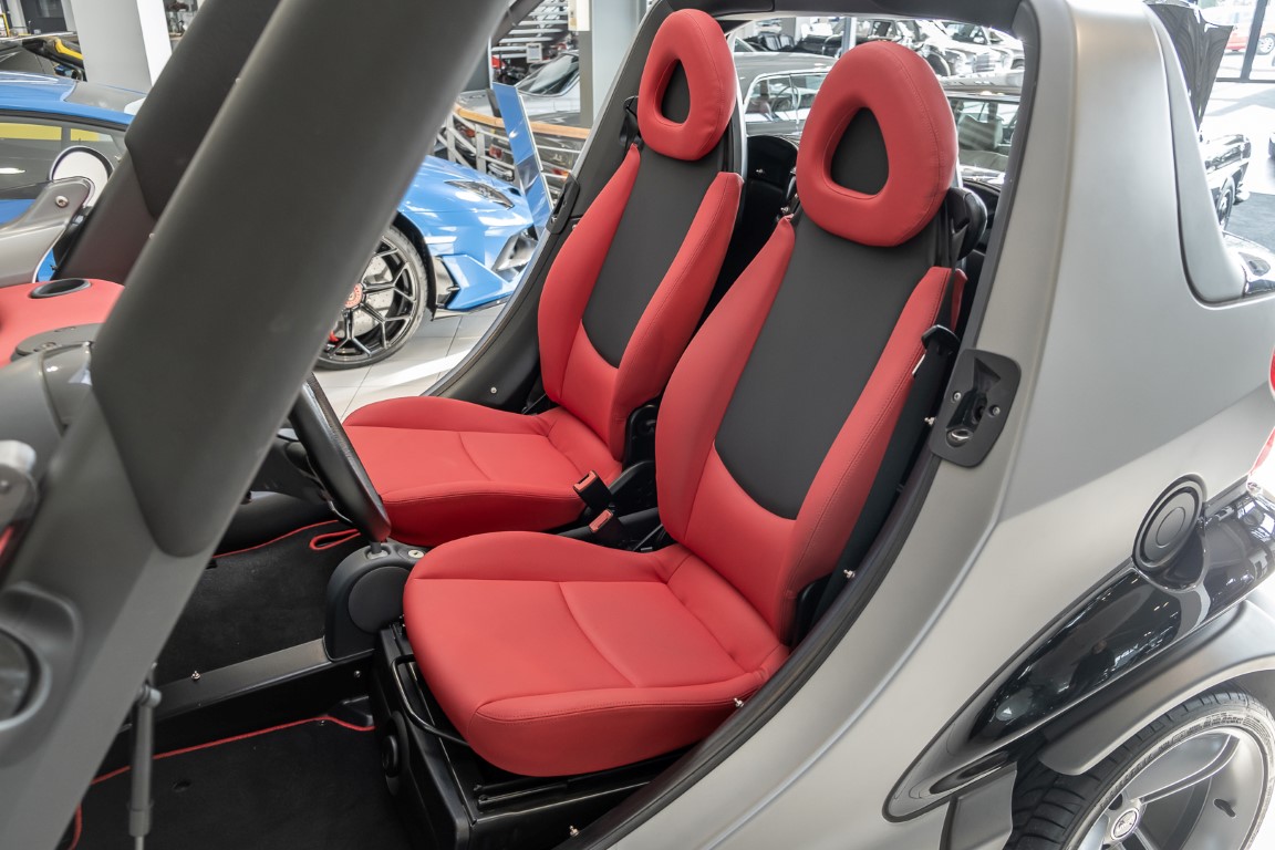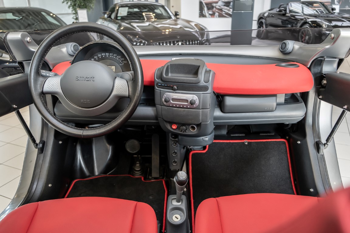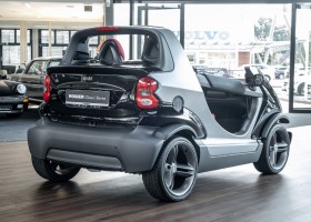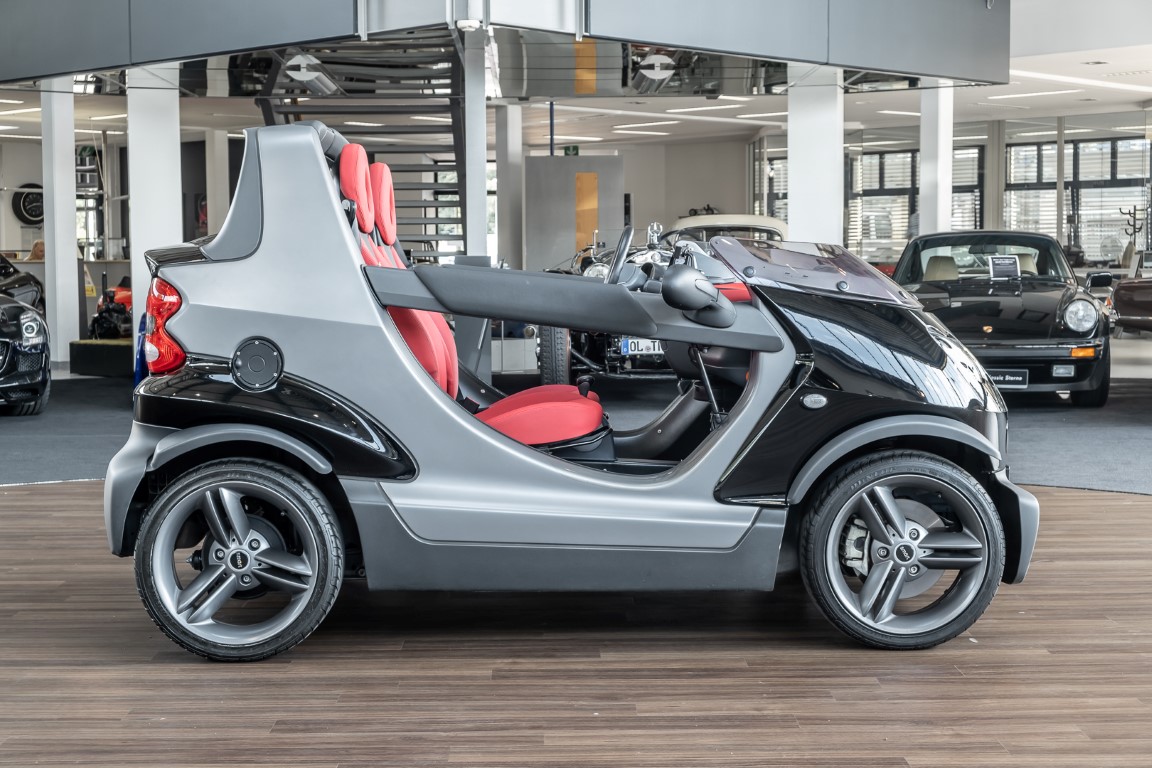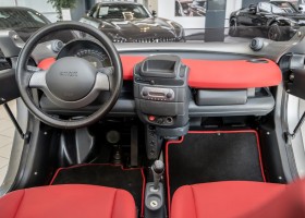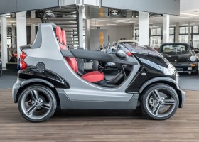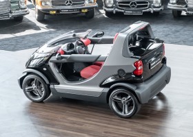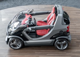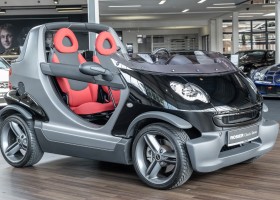 The Smart Crossblade is definitely a vehicle for individualists. The small-series fun vehicle, limited to 2000 units, promises a very special driving experience. Due to the open construction the driver feels more like being on a motorcycle than in a car. The 70 horsepower has hardly any load with the 730 kg light Smart, which is electronically limited only at 135 km/h. Thanks to a clever mix of materials, even rainy weather cannot harm the vehicle. The instrument panel and seats are covered with a waterproof, fire-red plastic, the floor of the interior is made like a bathtub with four drainage channels that lead the water outside in heavy rain.